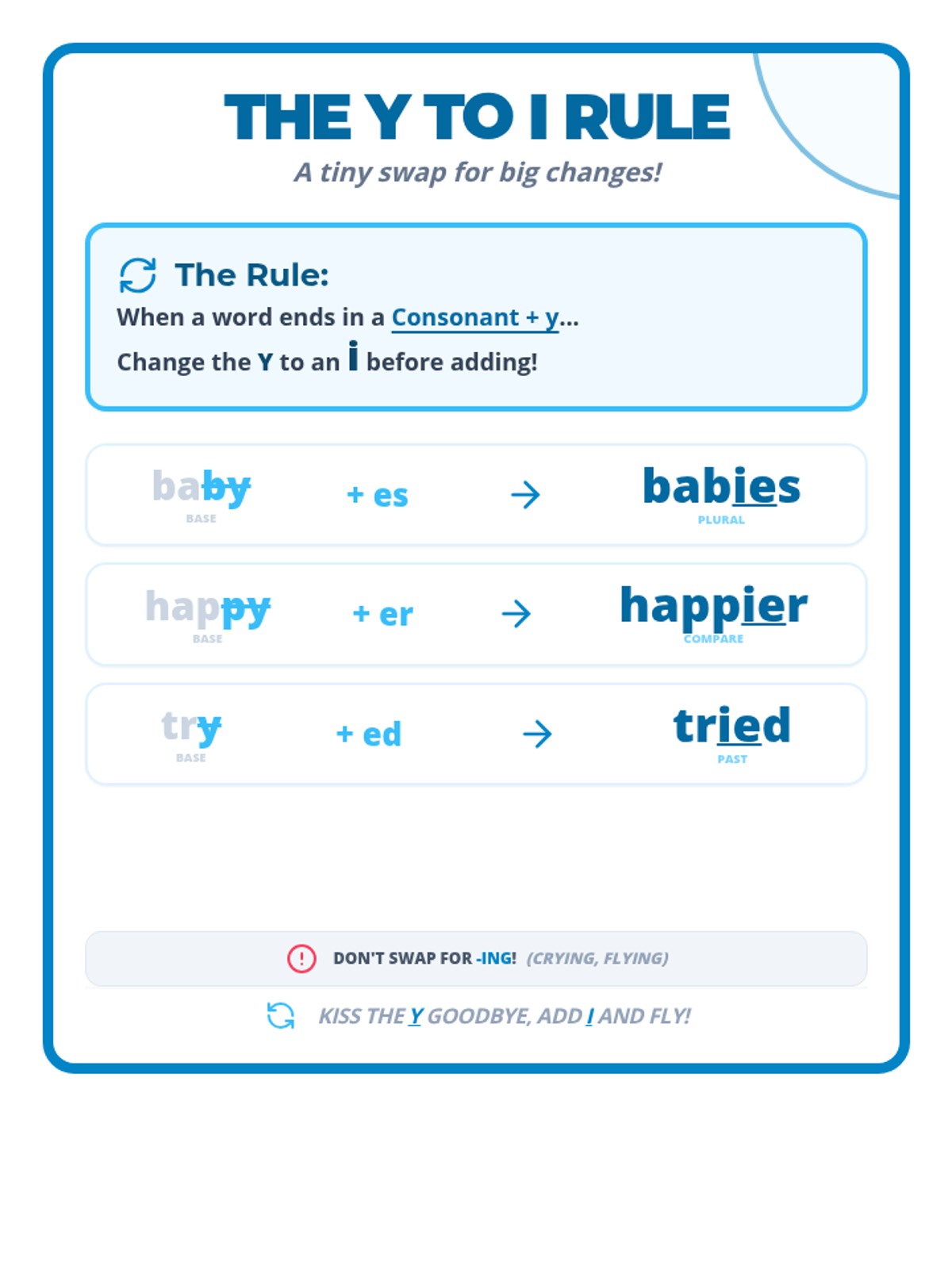 A full-page anchor chart for the Y to i Rule, illustrating how to change final y to i before adding various suffixes, with a reminder about the -ing exception.