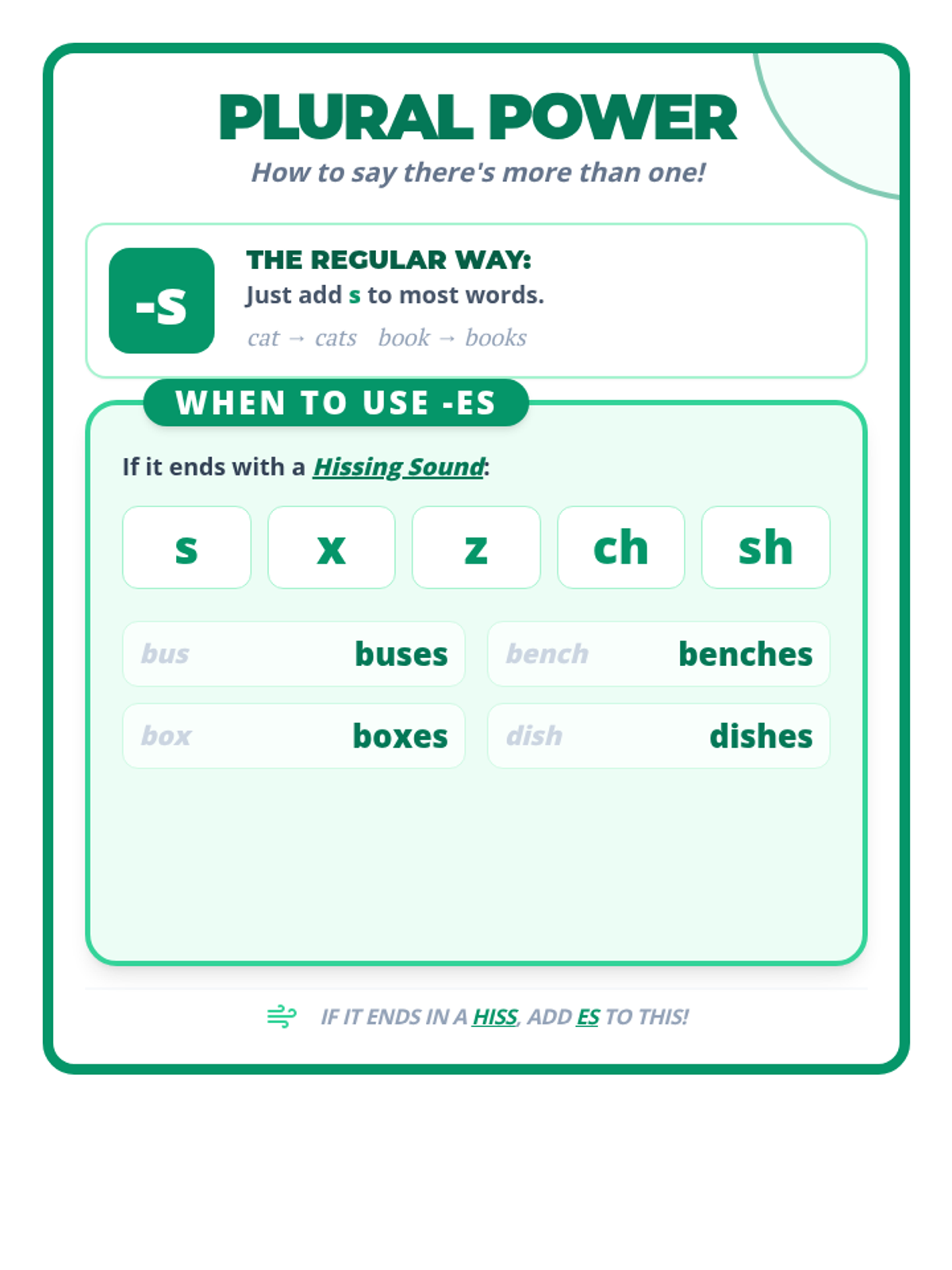 A full-page anchor chart for the Plural Power rule, explaining the standard -s ending and the -es ending for words with "hissing" sounds.