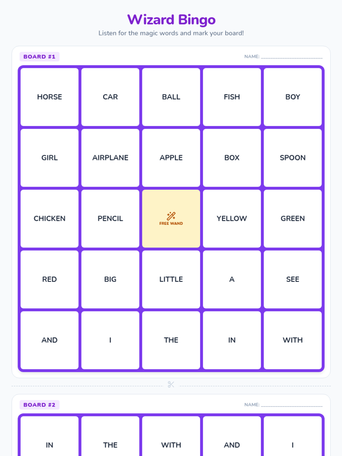 Two unique 5x5 Wizard Bingo boards featuring the target vocabulary words. Includes a decorative "Free Wand" center space and magical theme consistent with the lesson set. Both boards use a standardized set of 24 words.