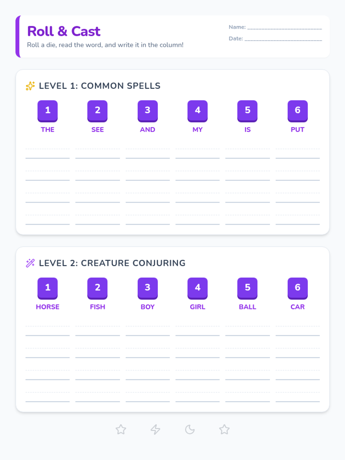 A magical-themed roll-and-write worksheet where students roll a die and practice writing specific sight words and nouns in columns. Includes two levels of difficulty with common function words and creature/object nouns.
