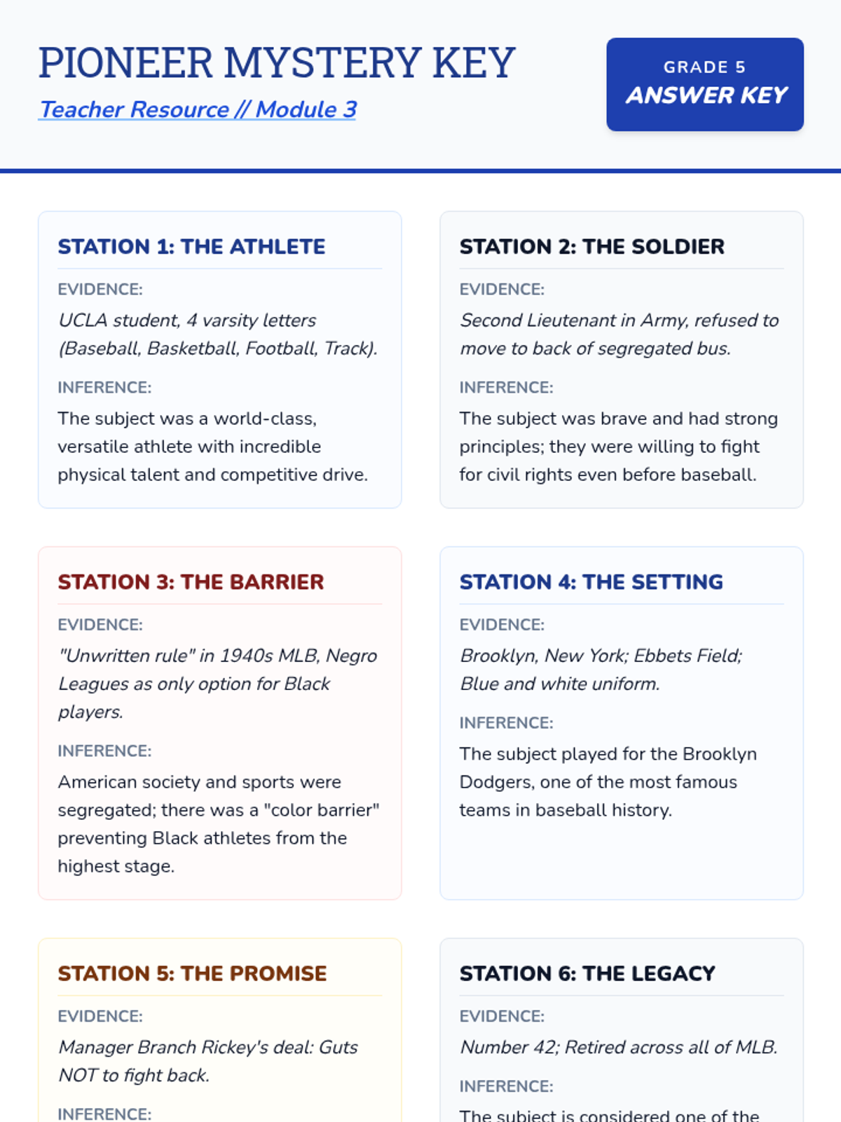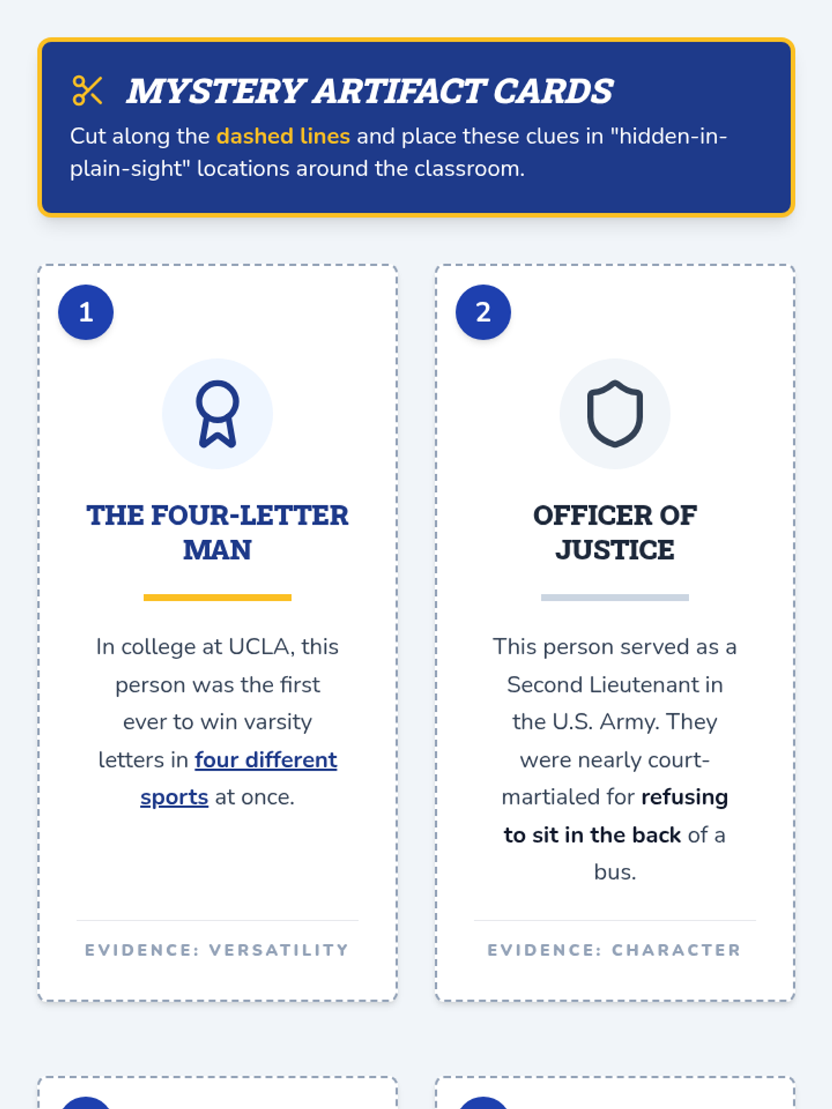 A set of six printable mystery artifact cards designed for a classroom scavenger hunt to help students infer the identity of Jackie Robinson through historical clues.
