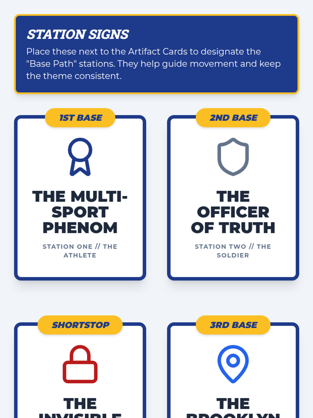 A set of printable station signs designed to help manage the movement-based scavenger hunt, using baseball diamond terminology for the stations.
