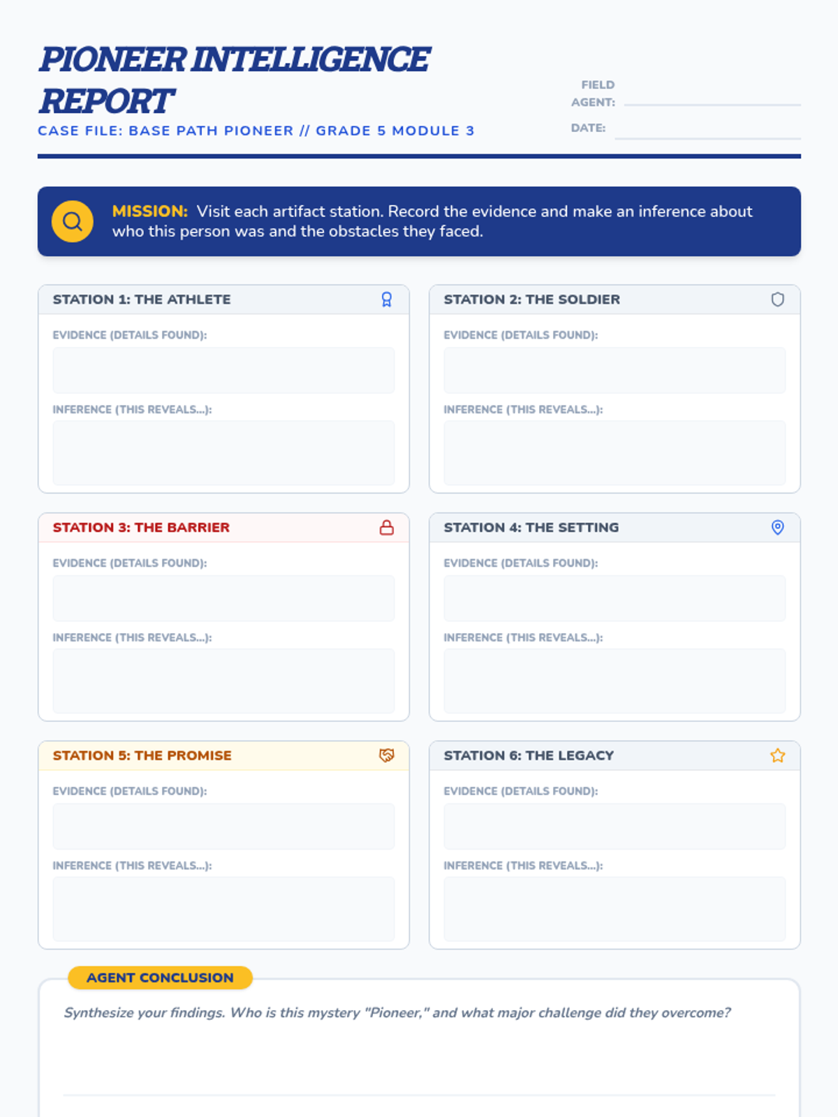 A student note-catcher for the Jackie Robinson "unveiling" lesson, designed as a mystery intelligence report to track evidence and inferences from the scavenger hunt.