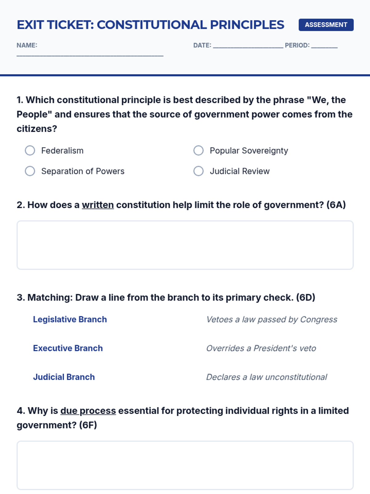 A quick assessment (exit ticket) covering the core principles of the U.S. Constitution (TEKS 6A, 6D, 6F), including popular sovereignty, written constitution, checks and balances, and due process.