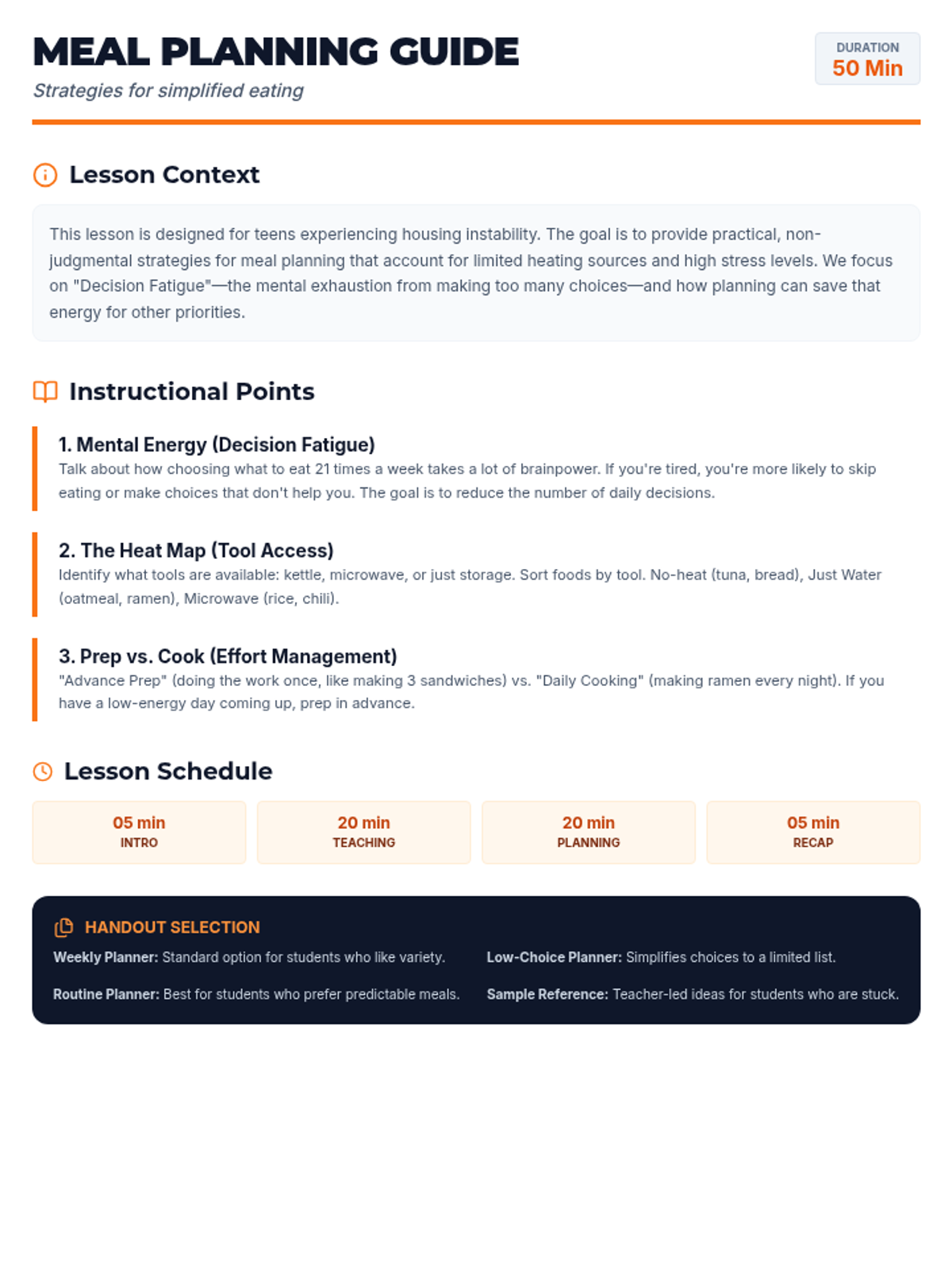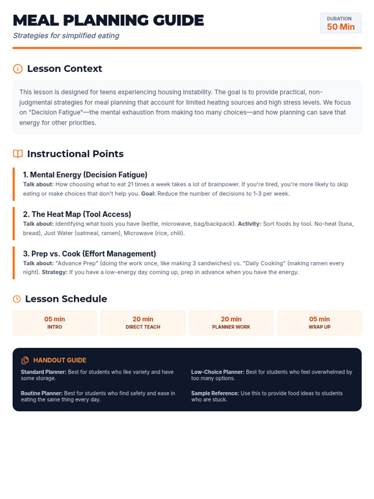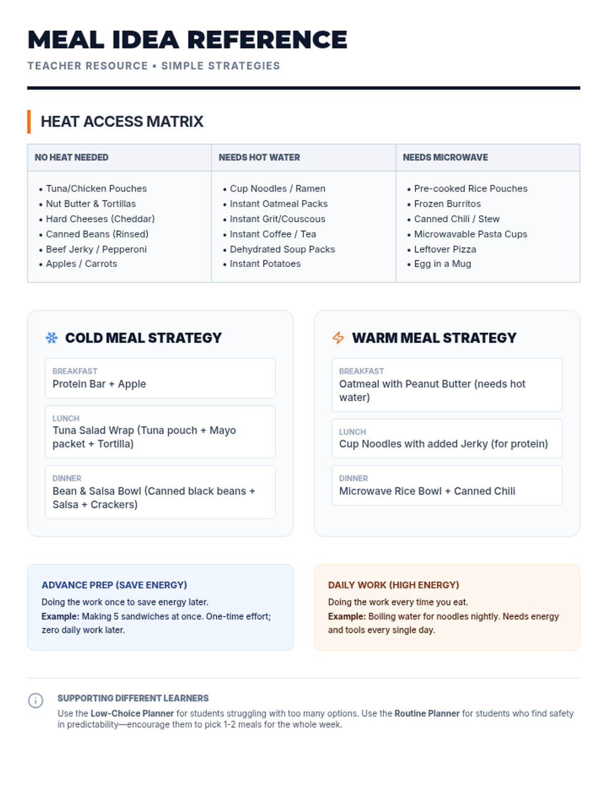 A teacher reference guide for meal ideas and strategies, updated with direct and grounded language. Removes 'weird' metaphors and focuses on heat access and prep-vs-cook tradeoffs.
