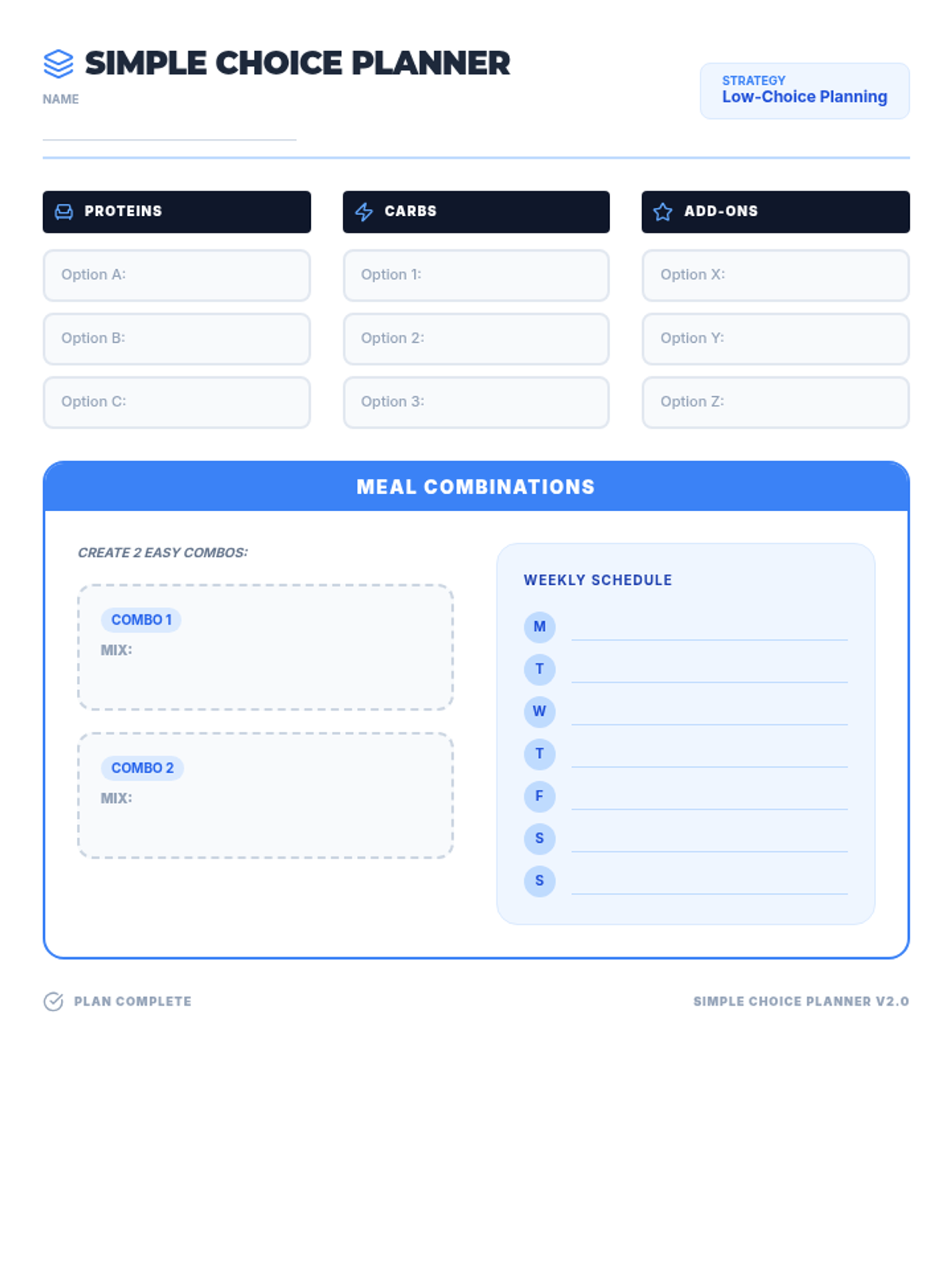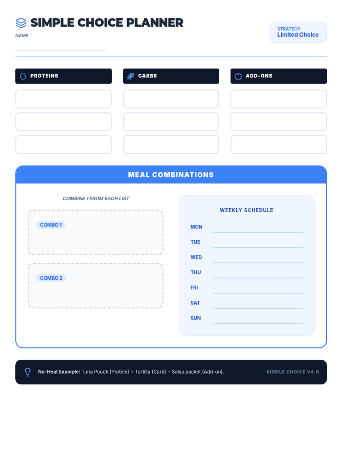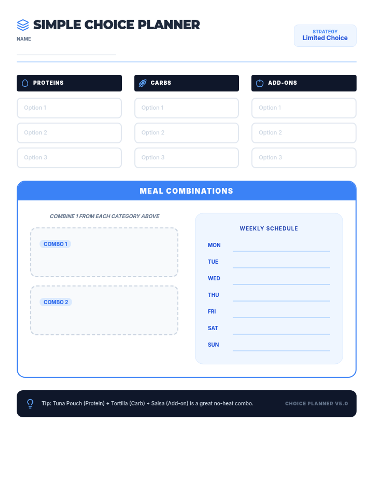 A low-choice meal planning worksheet for neurodiverse students, updated with grounded language (Option, Schedule, Builder) to remove 'weird' metaphors. Fits on one page. Improved spacing and updated icons. Final version.