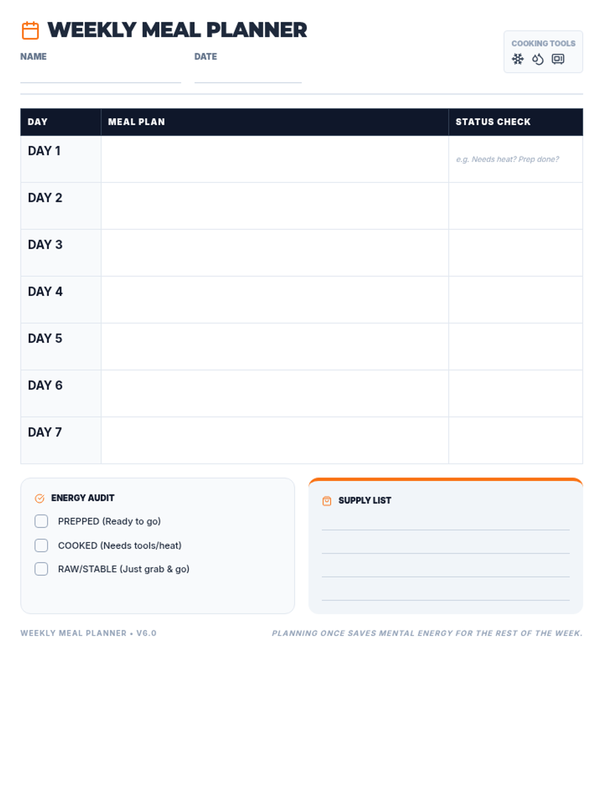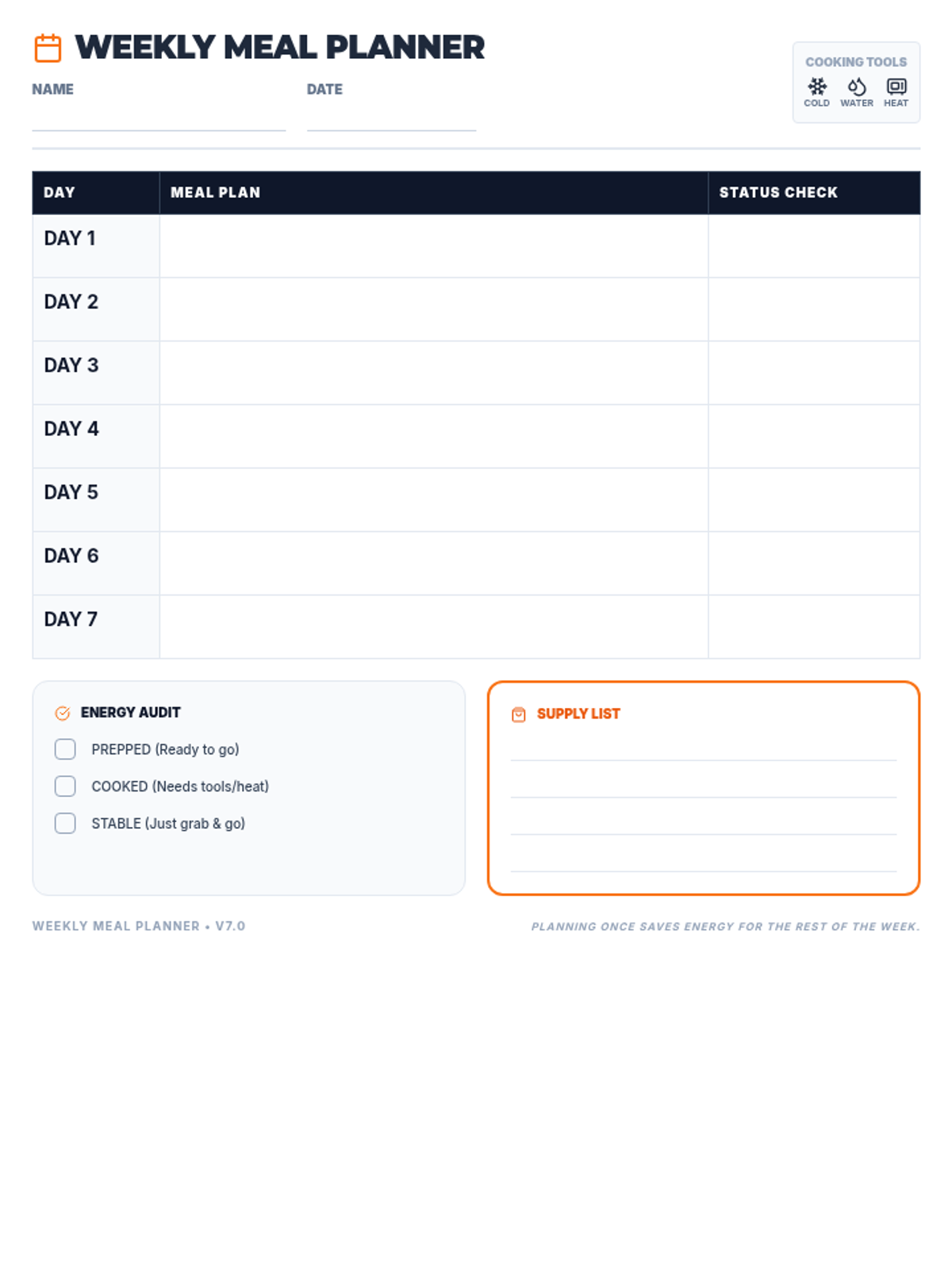 A standard 7-day meal planning worksheet updated with grounded language (Name, Date, Supply List) to remove 'weird' metaphors. Provides ample space for handwriting. Fixed Day 6/7 missing and legibility issues.