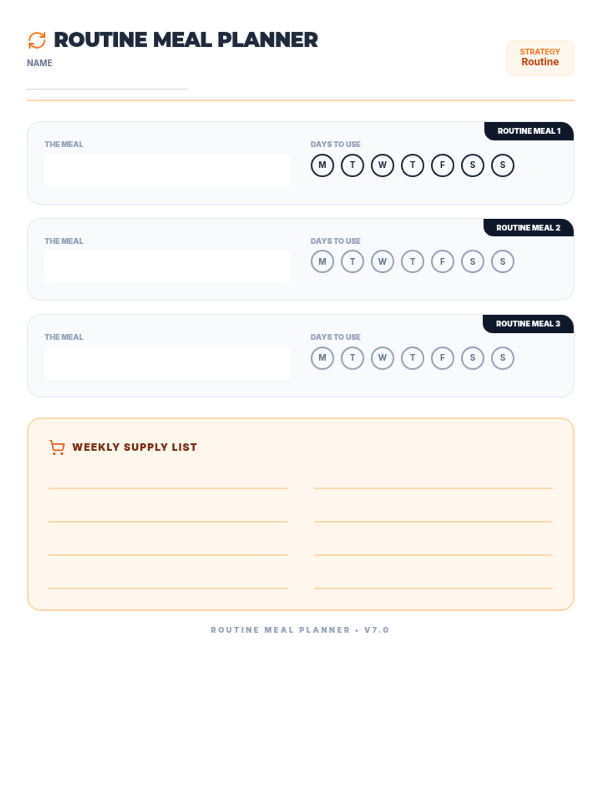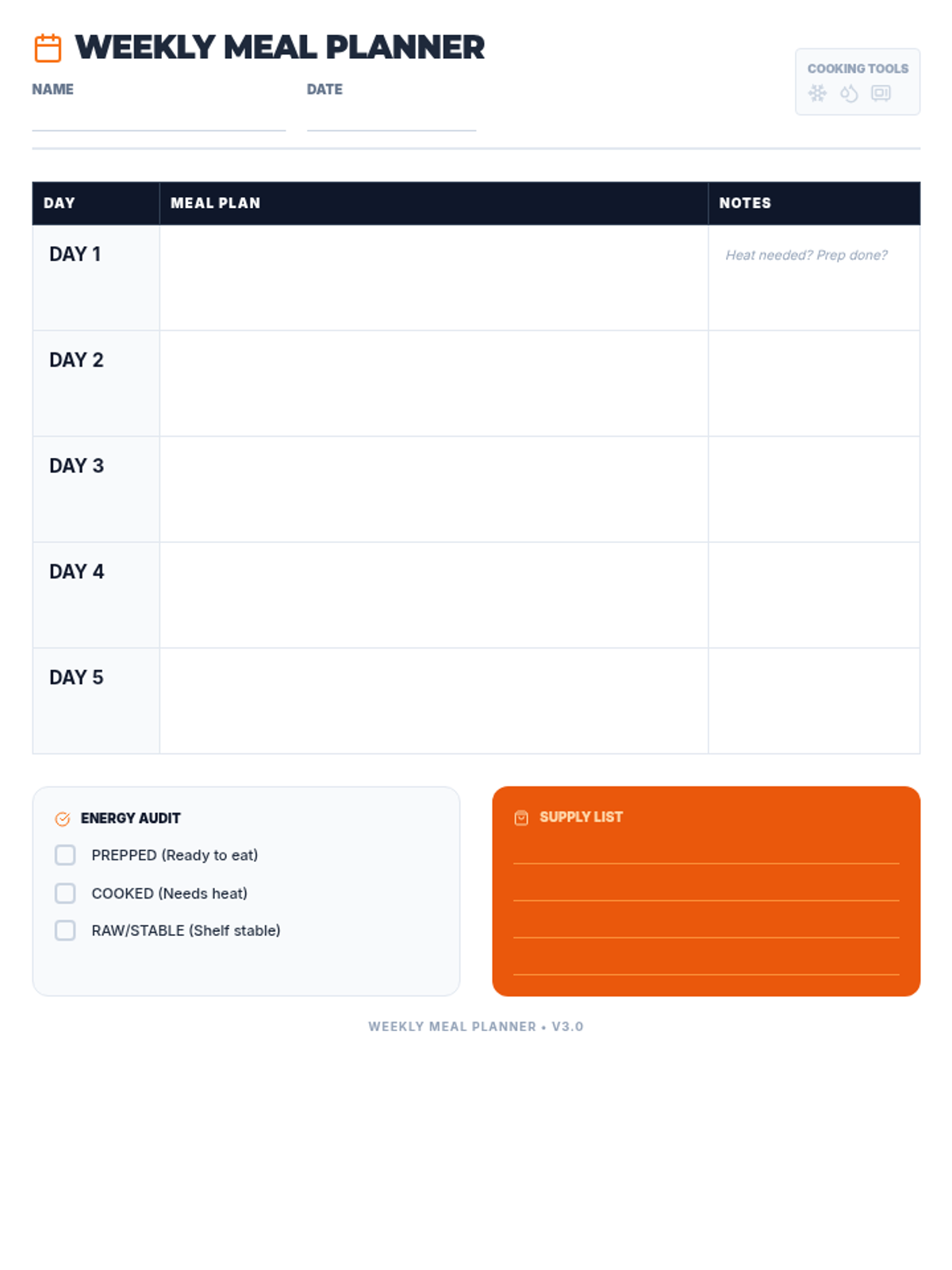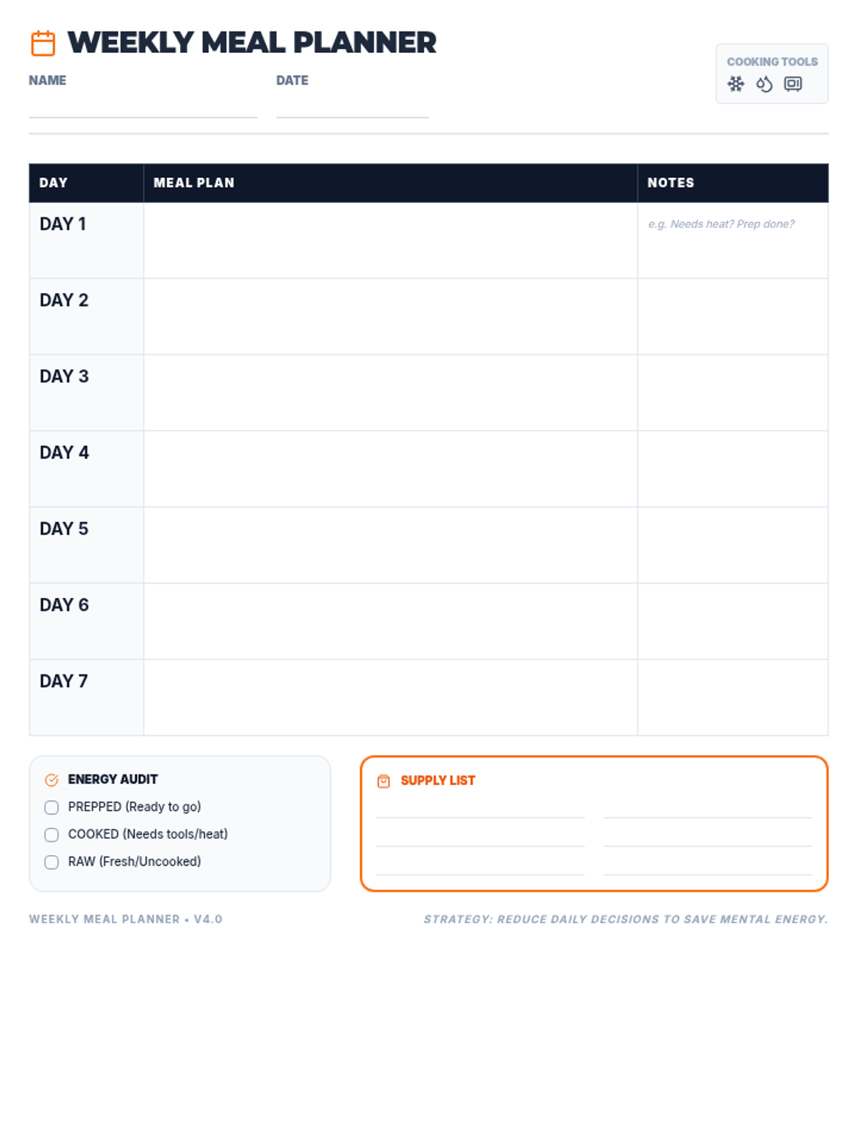 A standard 7-day meal planning worksheet updated with grounded language (Name, Date, Supply List) to remove 'weird' metaphors. Provides ample space for handwriting.