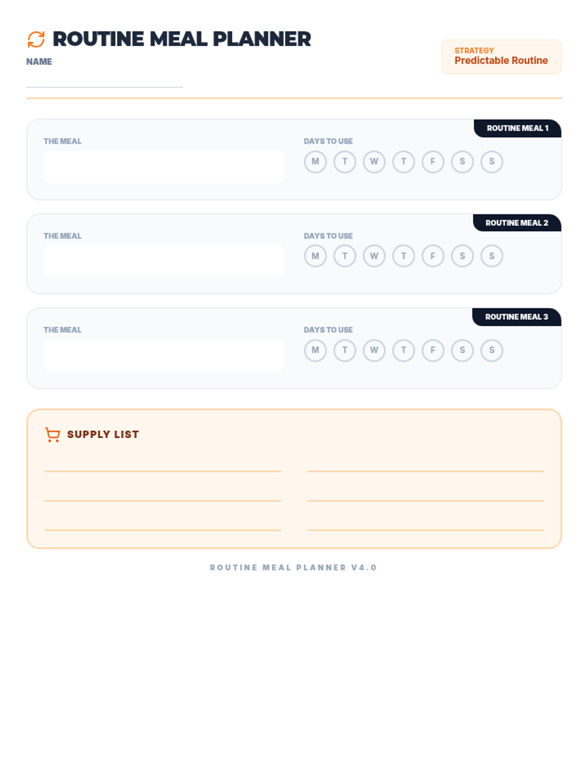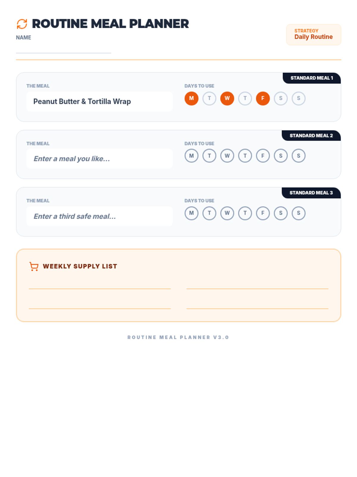 A repetition-friendly meal planning worksheet for neurodiverse students, updated with grounded language (Routine, Standard Meal, Supply List) to remove 'weird' metaphors. Fits on one page. Removed pre-filled placeholders and increased supply list size.