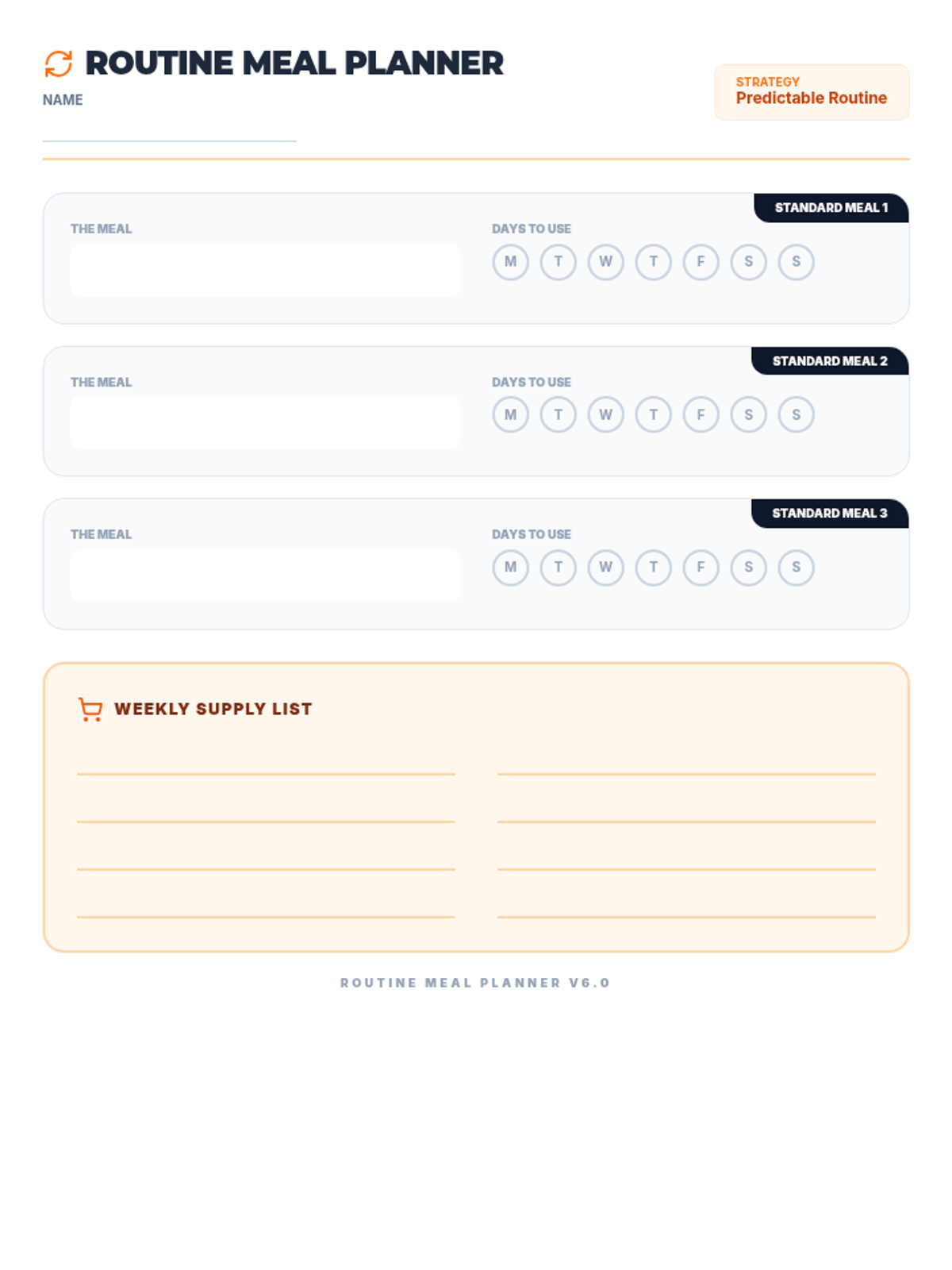 A repetition-friendly meal planning worksheet for neurodiverse students, updated with grounded language (Routine, Standard Meal, Supply List) to remove 'weird' metaphors. Fits on one page. Removed pre-filled placeholders and increased supply list size. Revised for better spacing. Final version.
