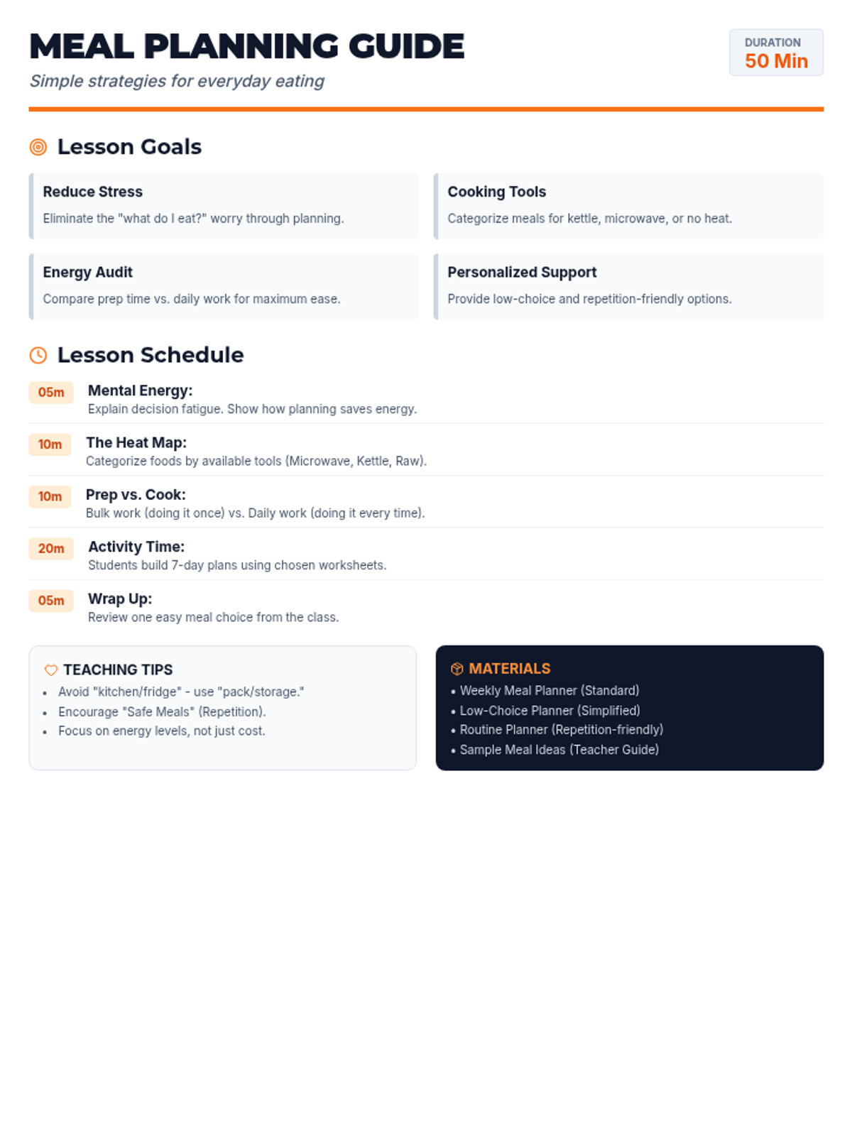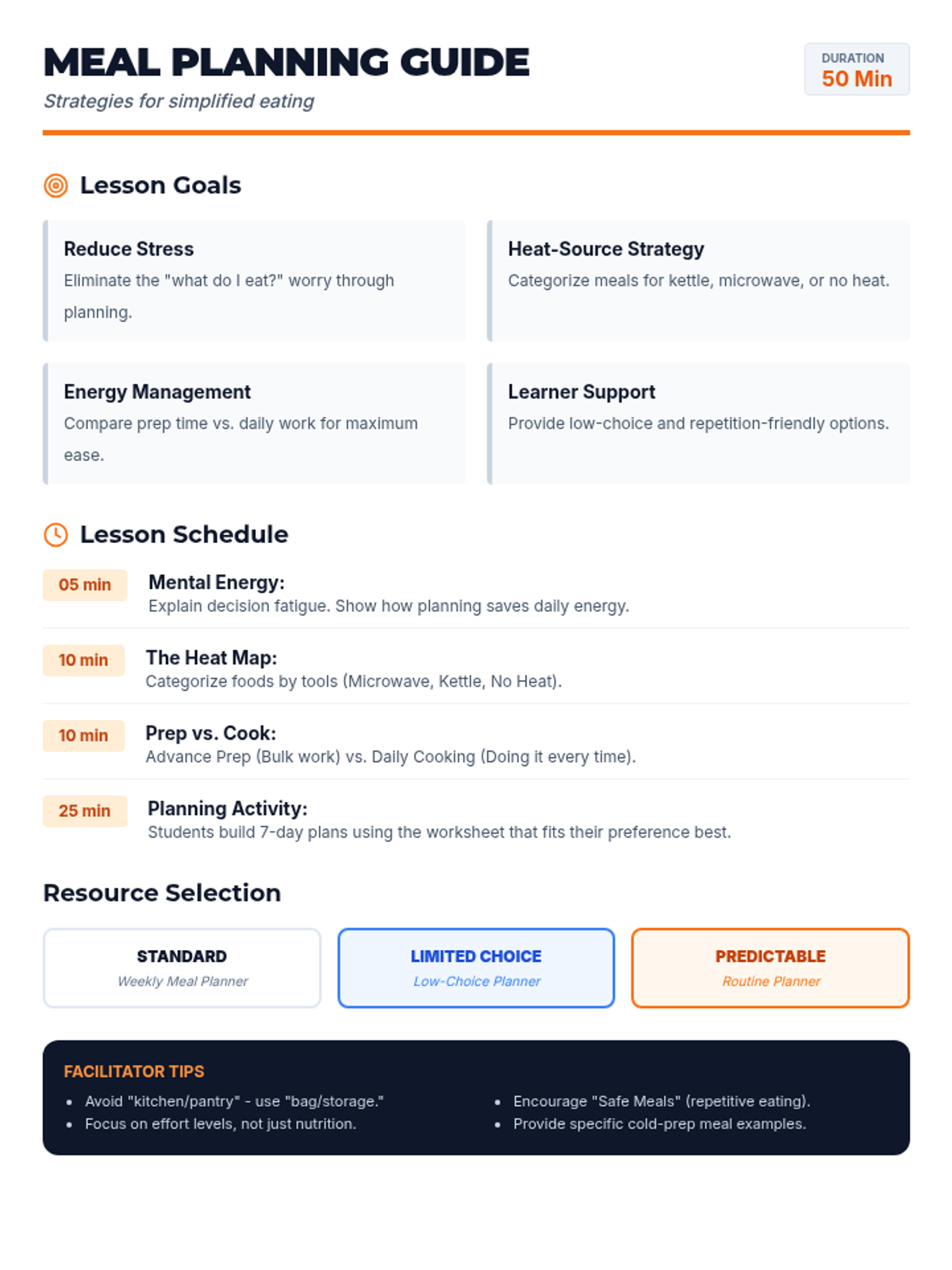 A facilitator's guide for the meal planning lesson, updated with direct, grounded language to remove overly gamified or 'weird' metaphors. Includes a 50-minute schedule and teaching tips. Revised to address white space and font size concerns.