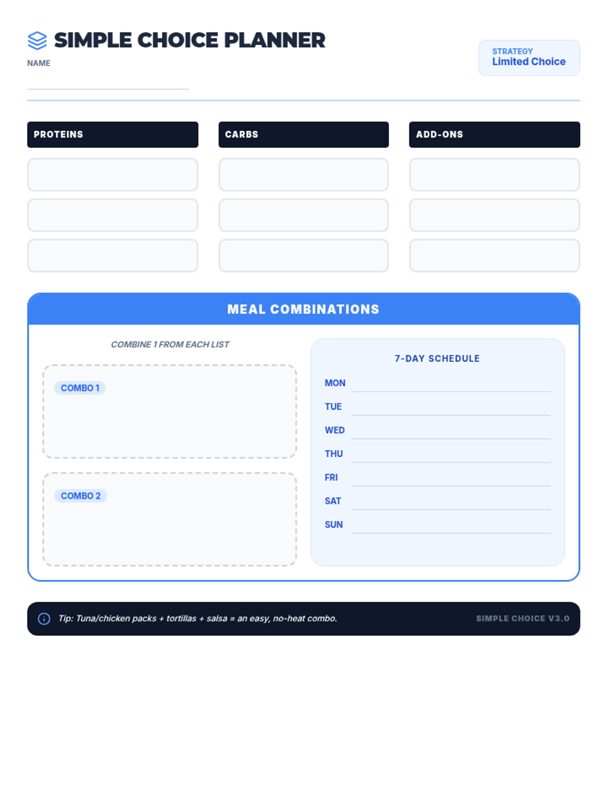 A standard 7-day meal planning worksheet updated with grounded language (Name, Date, Supply List) to remove 'weird' metaphors. Provides ample space for handwriting. Fixed Day 6/7 missing and legibility issues. Improved contrast in the supply list.