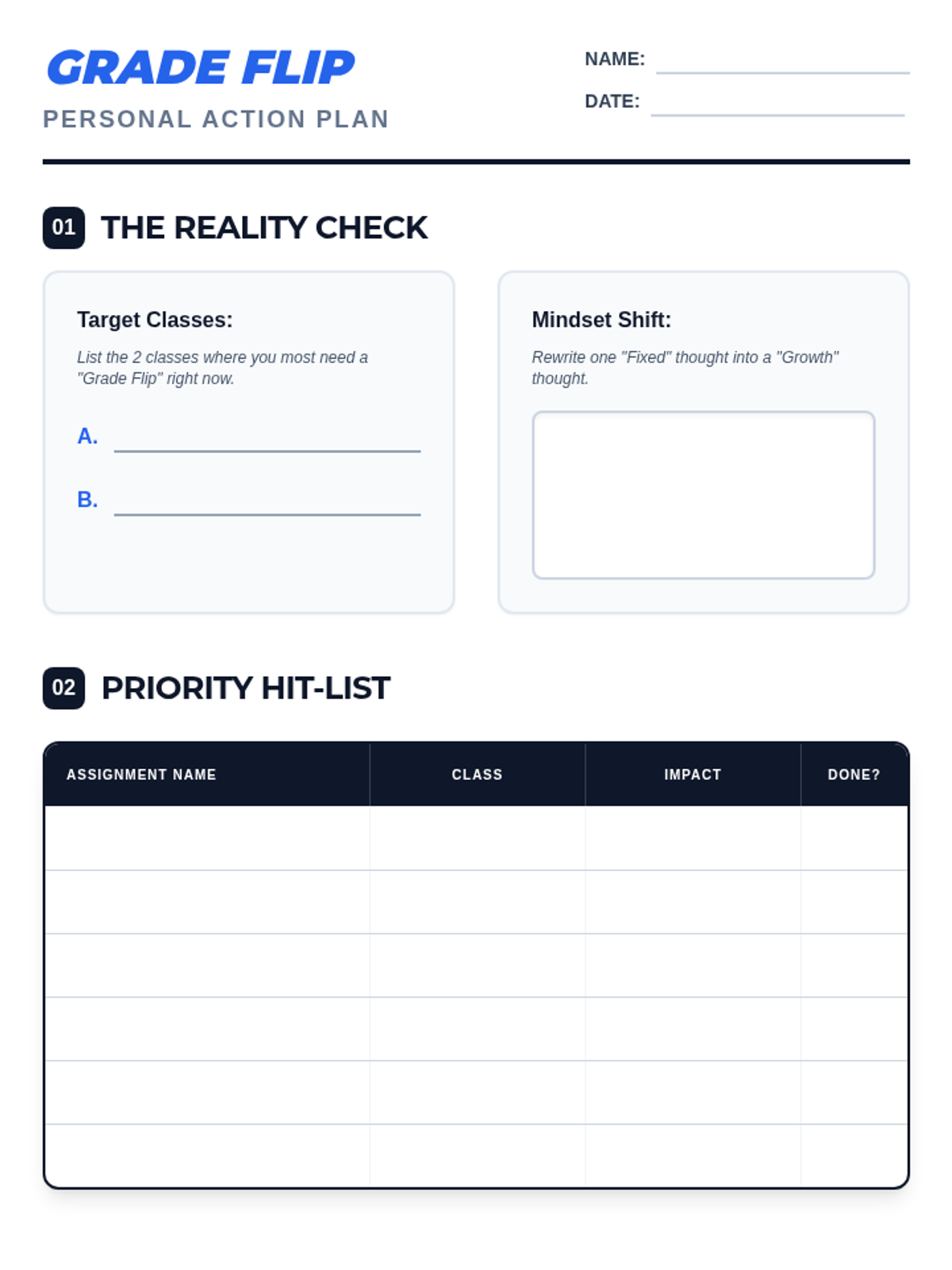A practical action plan worksheet for students to apply the 'Grade Flip' strategies. It includes sections for identifying goals, tracking missing work, drafting teacher communications, and planning focused study sprints.