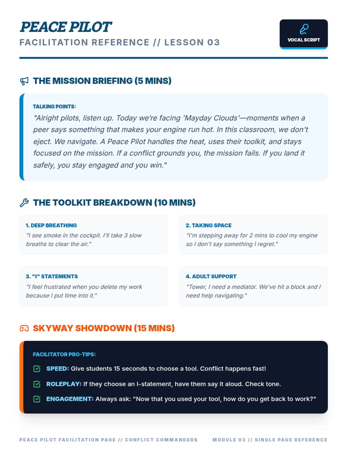 Detailed facilitation page for the 'Peace Pilot' lesson, featuring scripts, talking points, and specific tips for managing the 'Skyway Showdown' game.