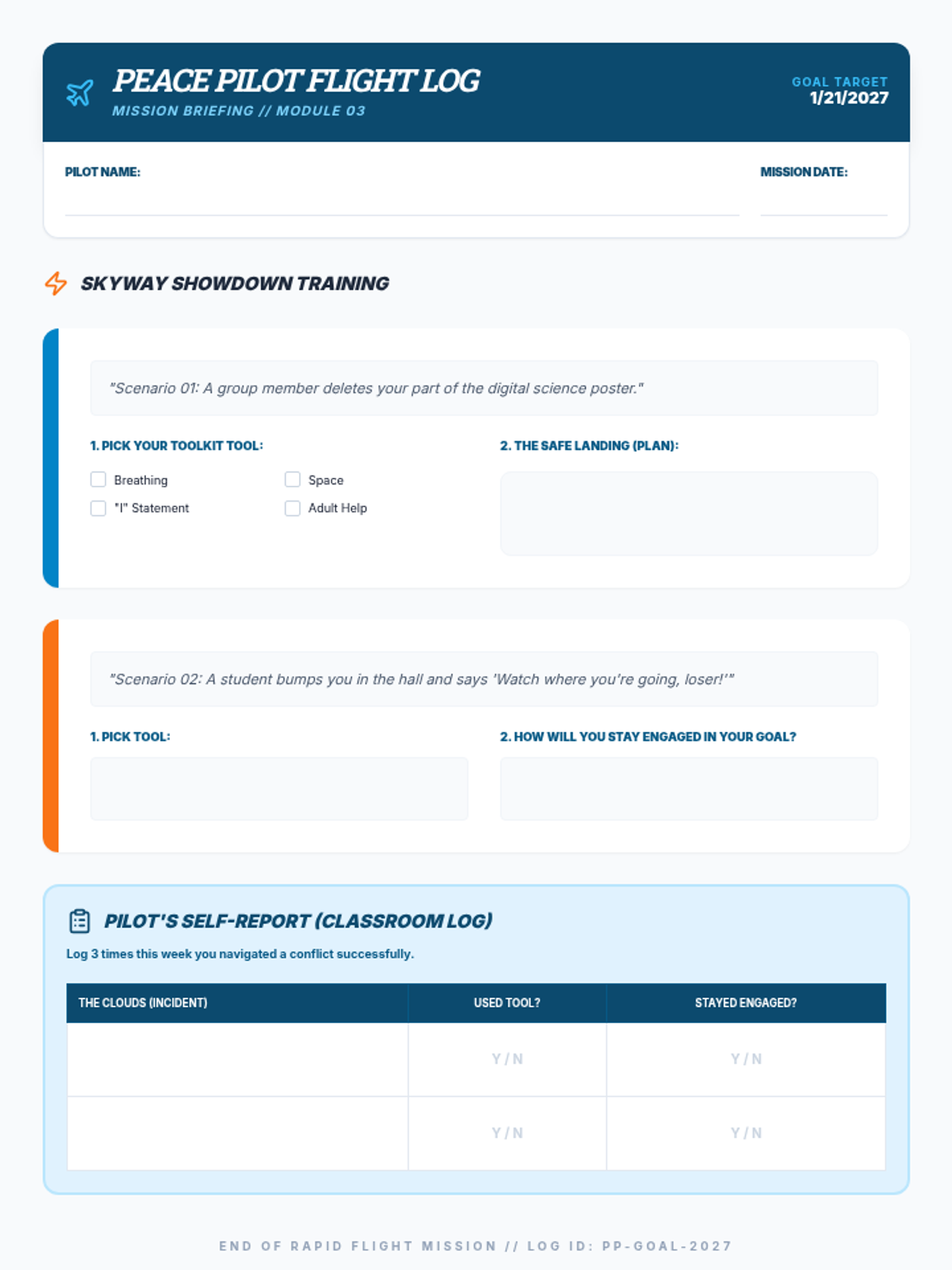 Student worksheet for the 'Peace Pilot' lesson, designed as a 'Flight Log' to practice the 4-step conflict resolution plan through peer scenarios.