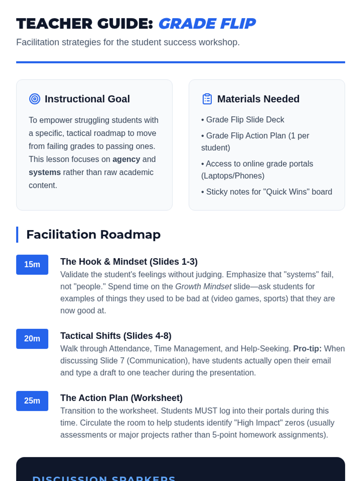 A comprehensive teacher guide for facilitating the Grade Flip workshop, including pacing, discussion prompts, and differentiation strategies.