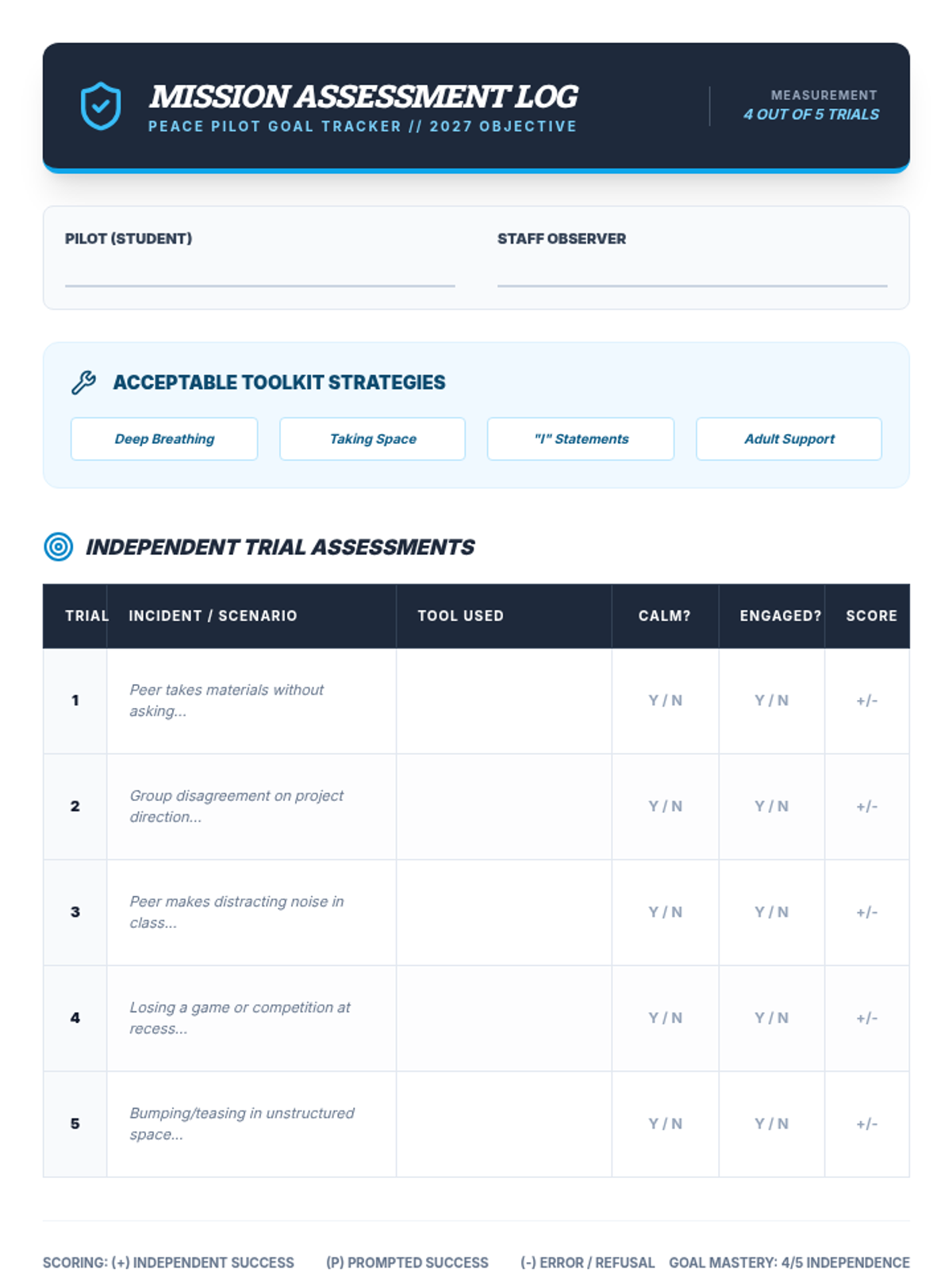 IEP Goal Tracker for the 'Peace Pilot' lesson, featuring five conflict resolution scenarios for trial assessment and an observation log for staff, excluding self-reports.