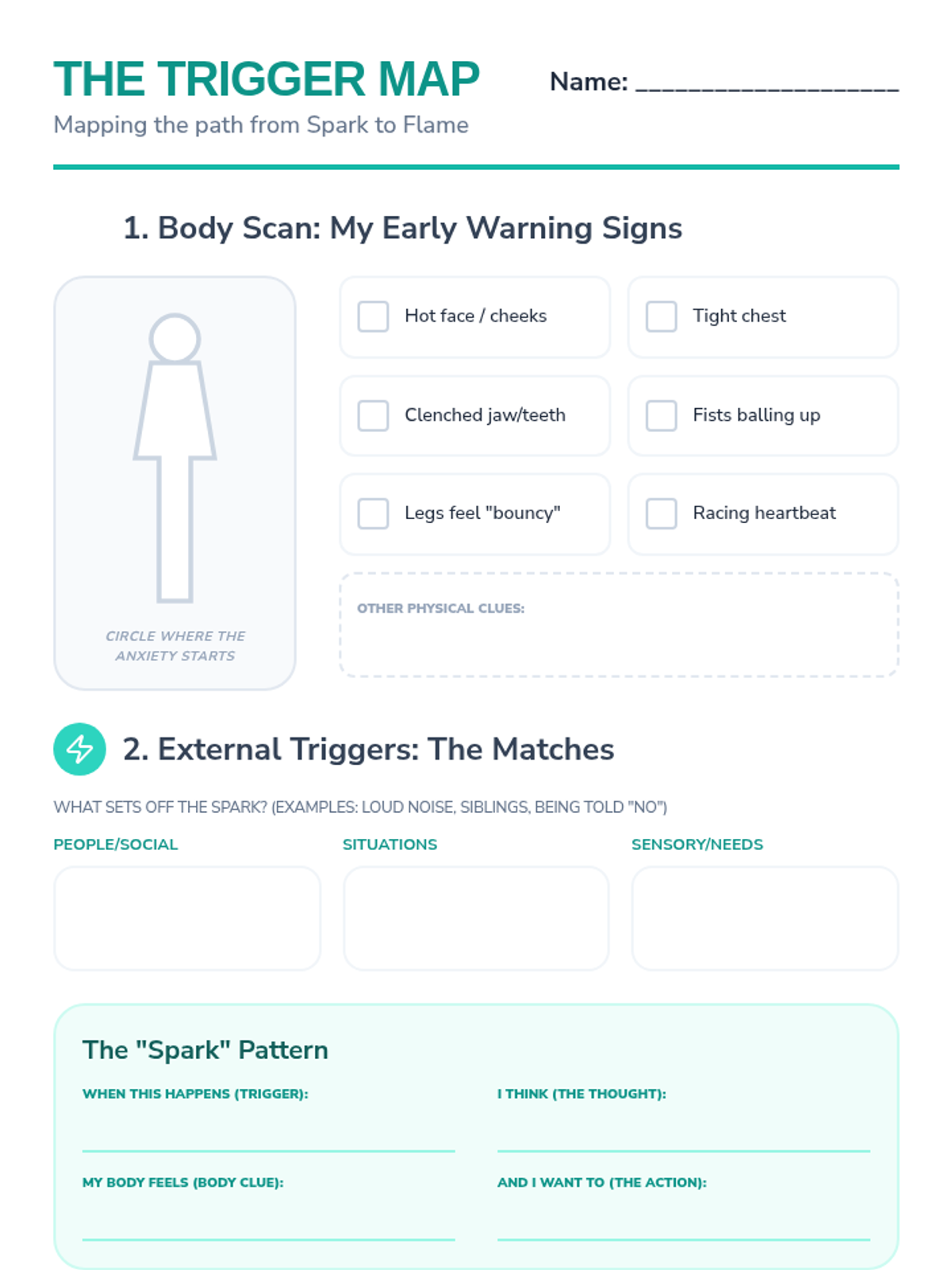 A worksheet for identifying internal body clues and external triggers for anger and anxiety, designed to help students map out their emotional responses.