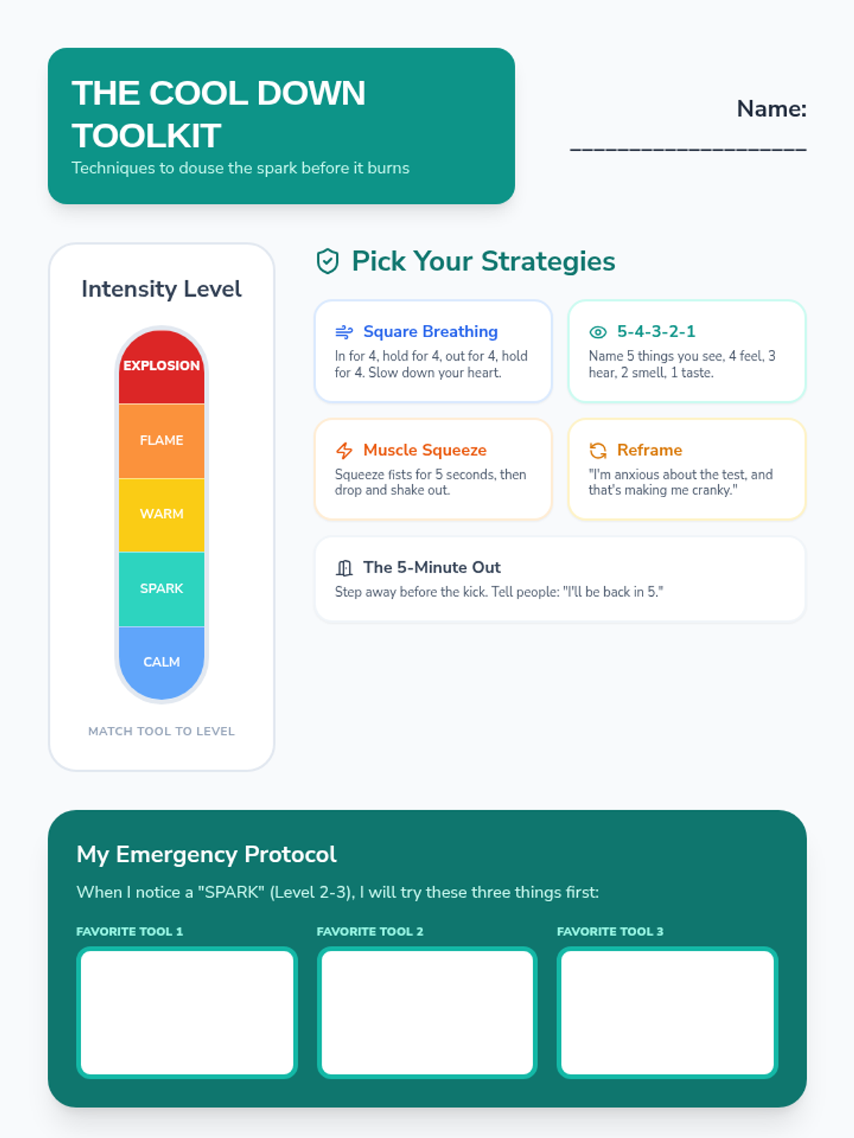 A visual reference guide for teenagers to select and practice self-regulation techniques based on their emotional intensity level.