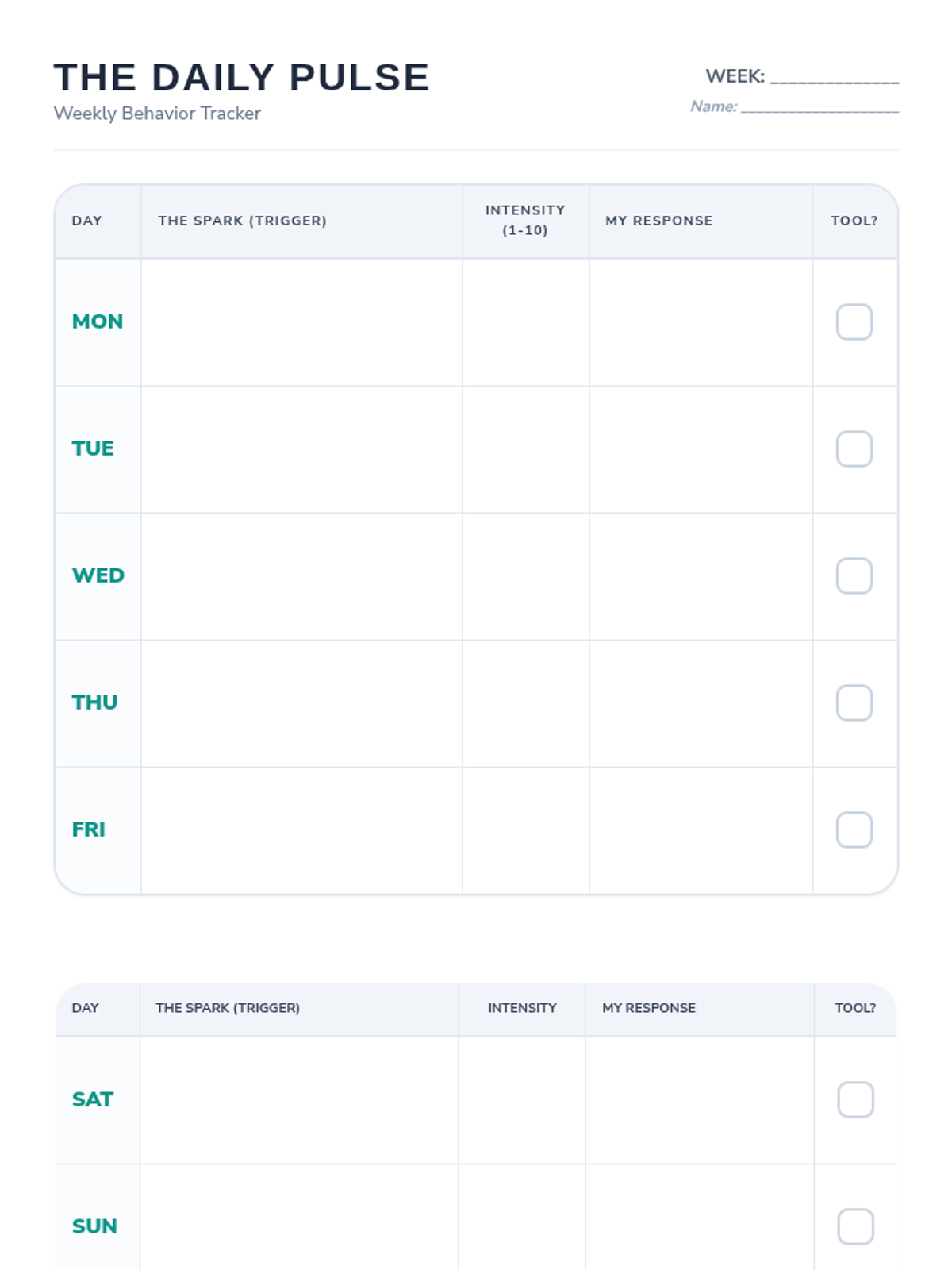 A daily behavior tracker for teenagers to monitor triggers, emotional intensity, and the use of coping strategies over the course of a week.