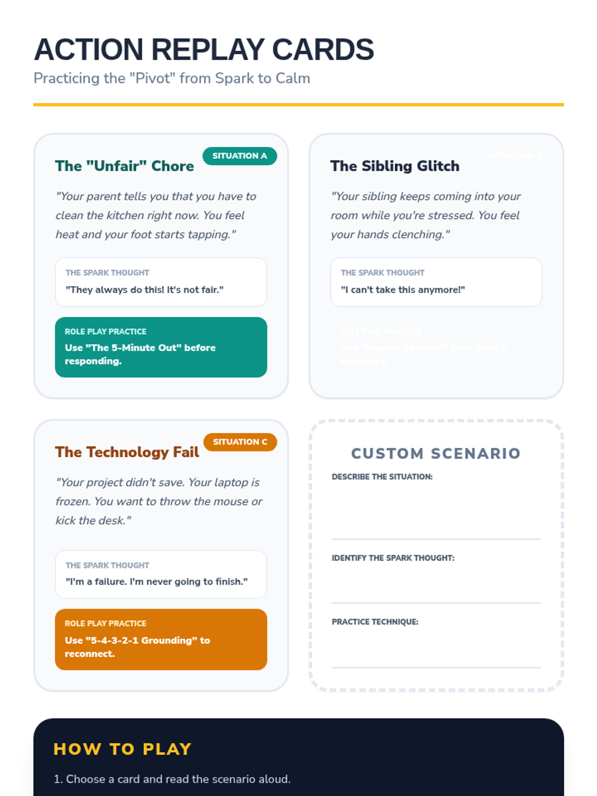 A fresh set of role-play cards with scripts and prompts for scenarios including sibling boundaries, social media pressure, group projects, and teacher feedback.