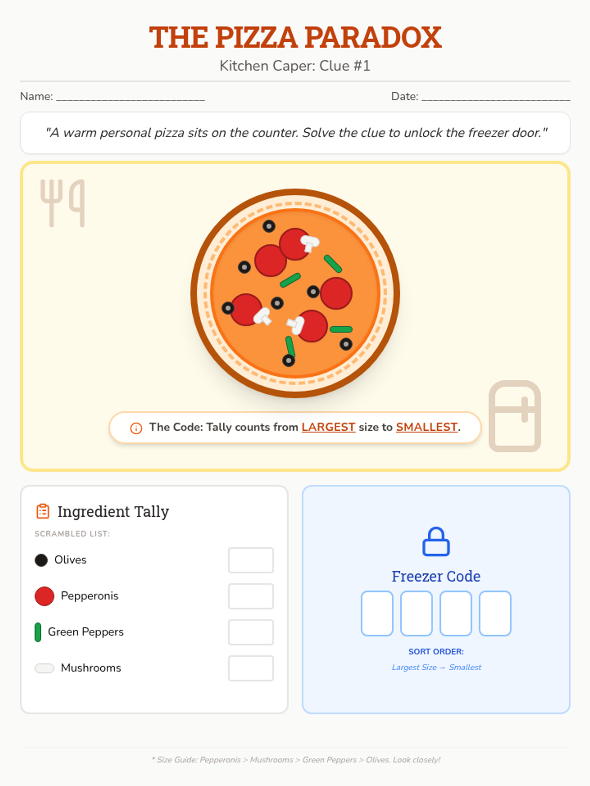 A visual observation puzzle where students tally pizza toppings to solve a freezer unlock code. Scrambled tally list and clarified size-based sorting logic. Fixed page break and opacity.