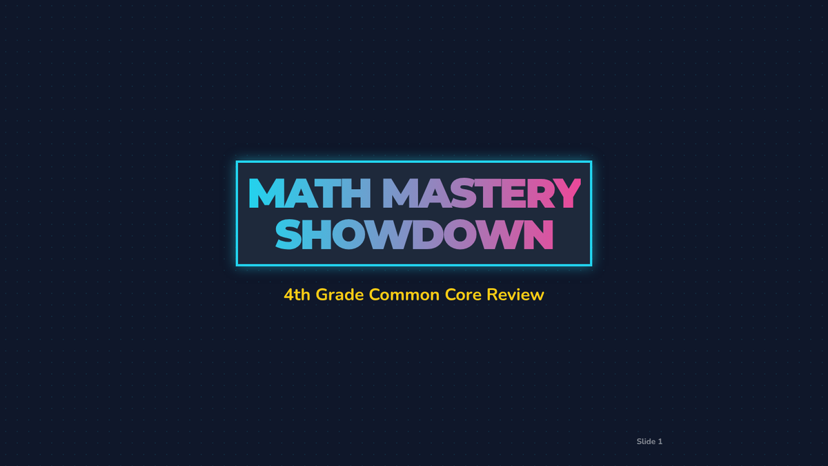A complete 63-slide arcade-themed 4th-grade math review deck. Includes full content for all 6 categories (Operations, Base Ten, Fractions, Measurement, Geometry, and Boss Level) with hidden answer slides and navigation aids.