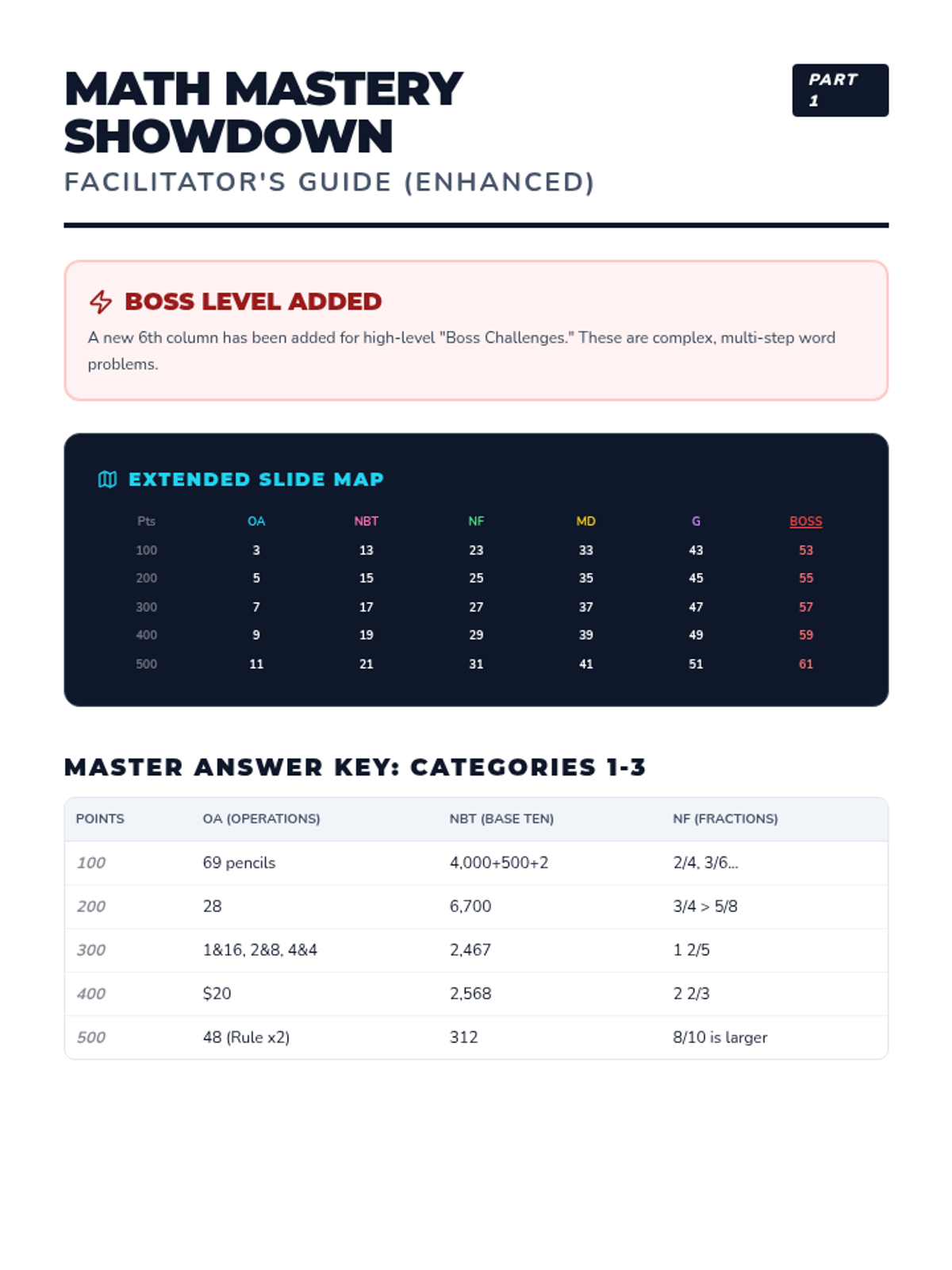 A comprehensive facilitation guide for the 4th-grade math review game. Now includes an "Extended Slide Map" for the 6th category and a dedicated "Boss Level" answer key with multi-step word problem breakdowns.