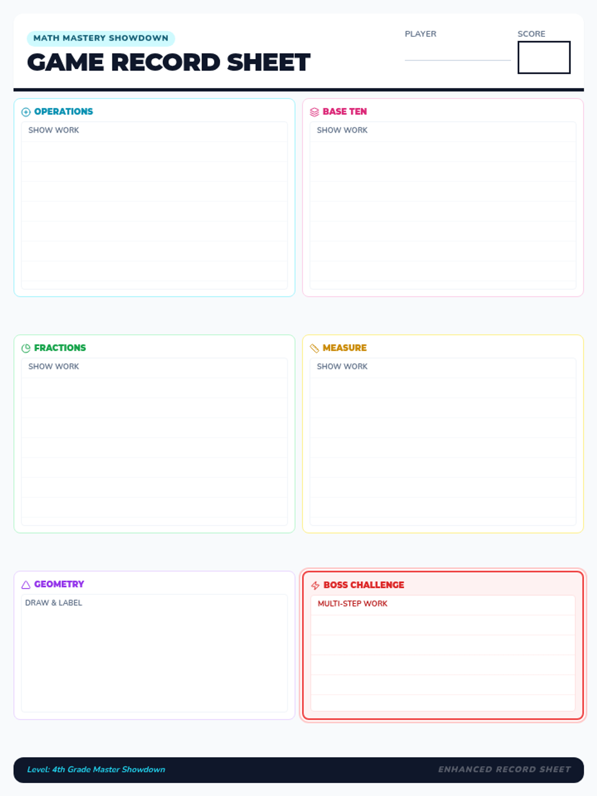 An updated student-facing record sheet for the math review game. Now includes a dedicated "Boss Challenge" work area for complex multi-step word problems, alongside the five standard Common Core domains.