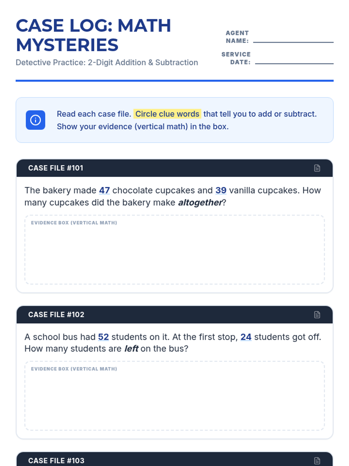 A student worksheet featuring 2-digit addition and subtraction word problems styled as detective case files. Includes space for showing work and identifying keywords.