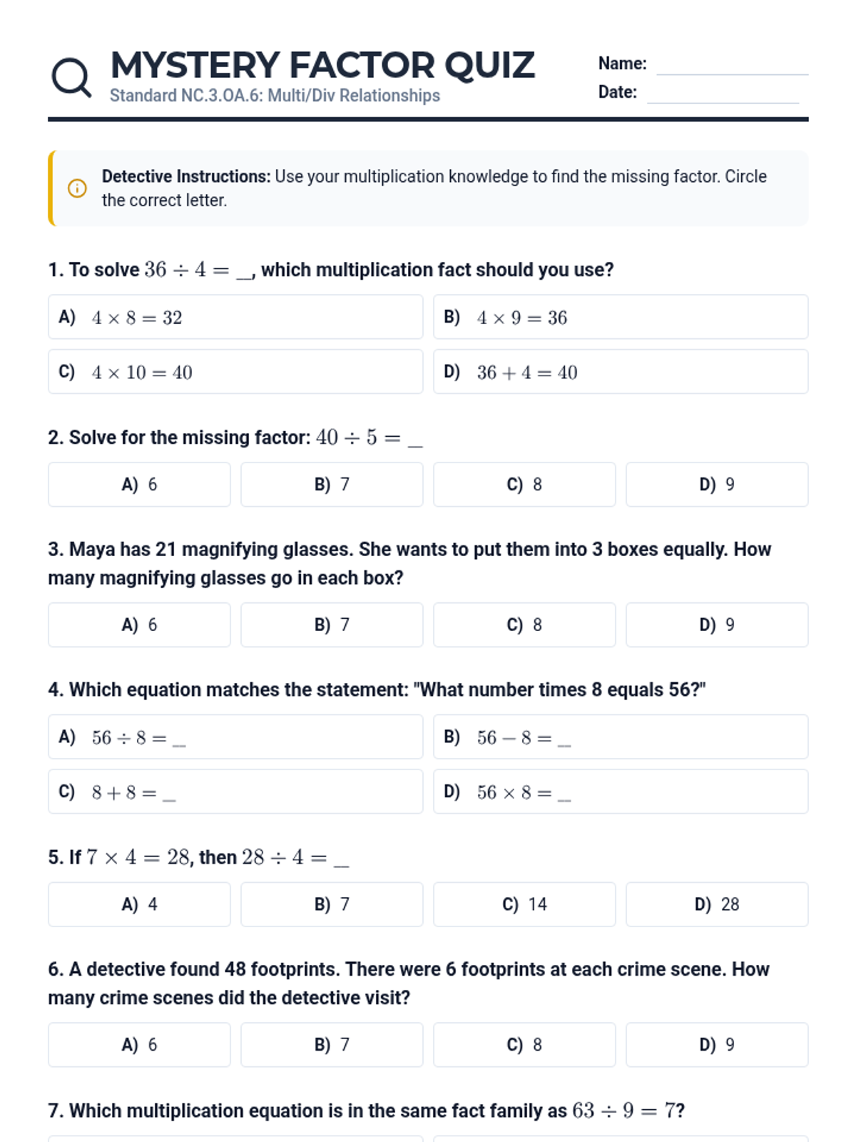 A 10-question multiple-choice quiz assessing students' ability to solve unknown-factor problems. Layout tightened to fit on a single page with improved icon alignment and standardized styling.