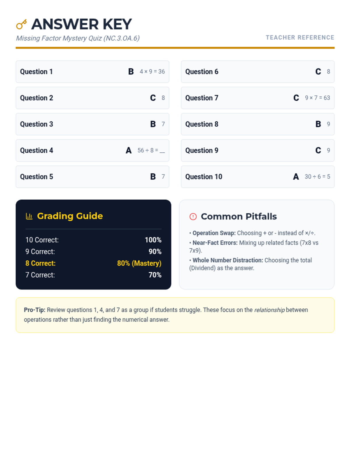 Final polished answer key for the Mystery Factor Quiz. Optimized for single-page printing with high-contrast text and standard math symbols for reliable rendering.
