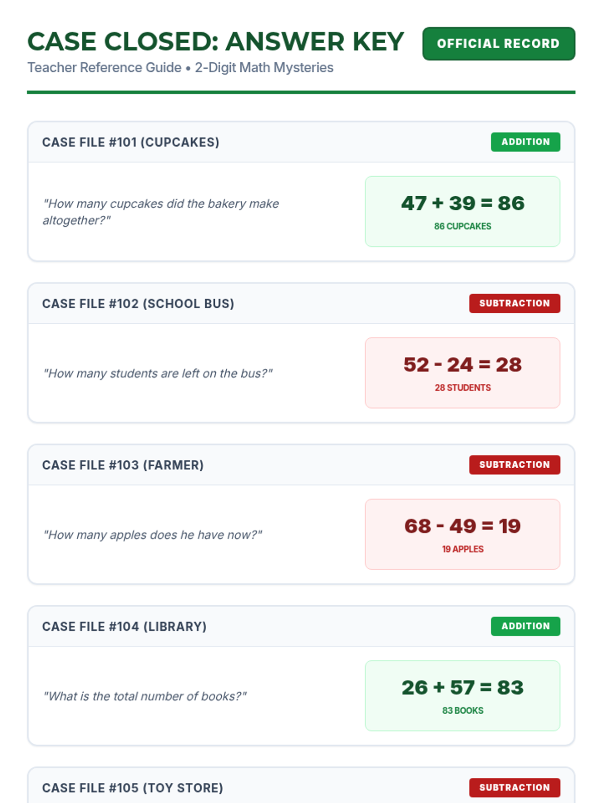 An answer key and teacher guide for the 2-digit word problem worksheet, featuring step-by-step solutions and teaching tips.