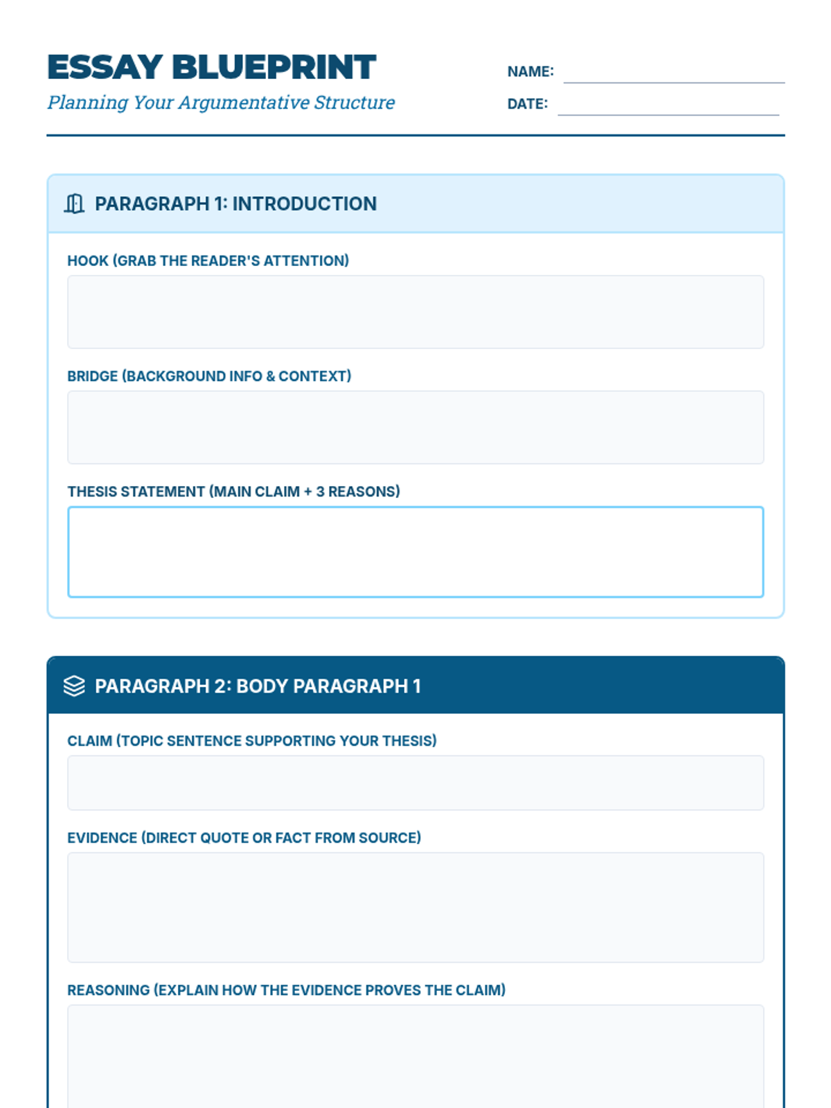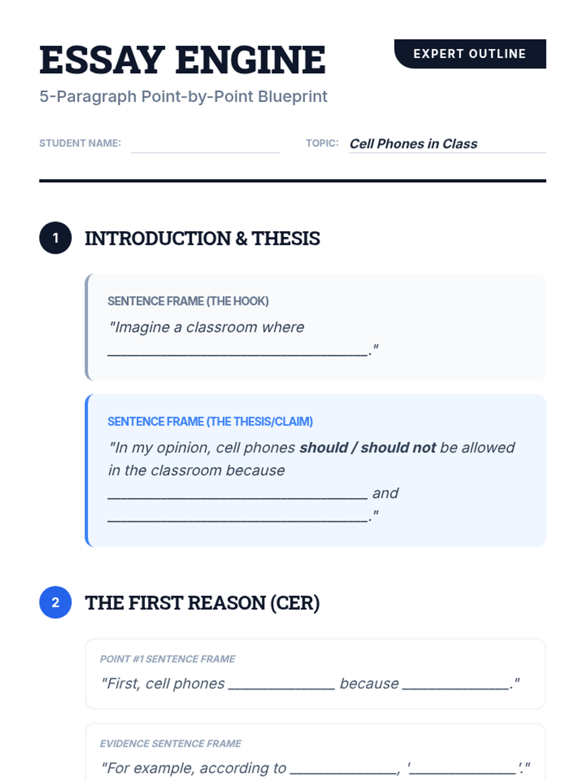 A detailed 5-paragraph argumentative essay outline for students, featuring sentence frames and clear structural guidance for a point-by-point defense of their claim.