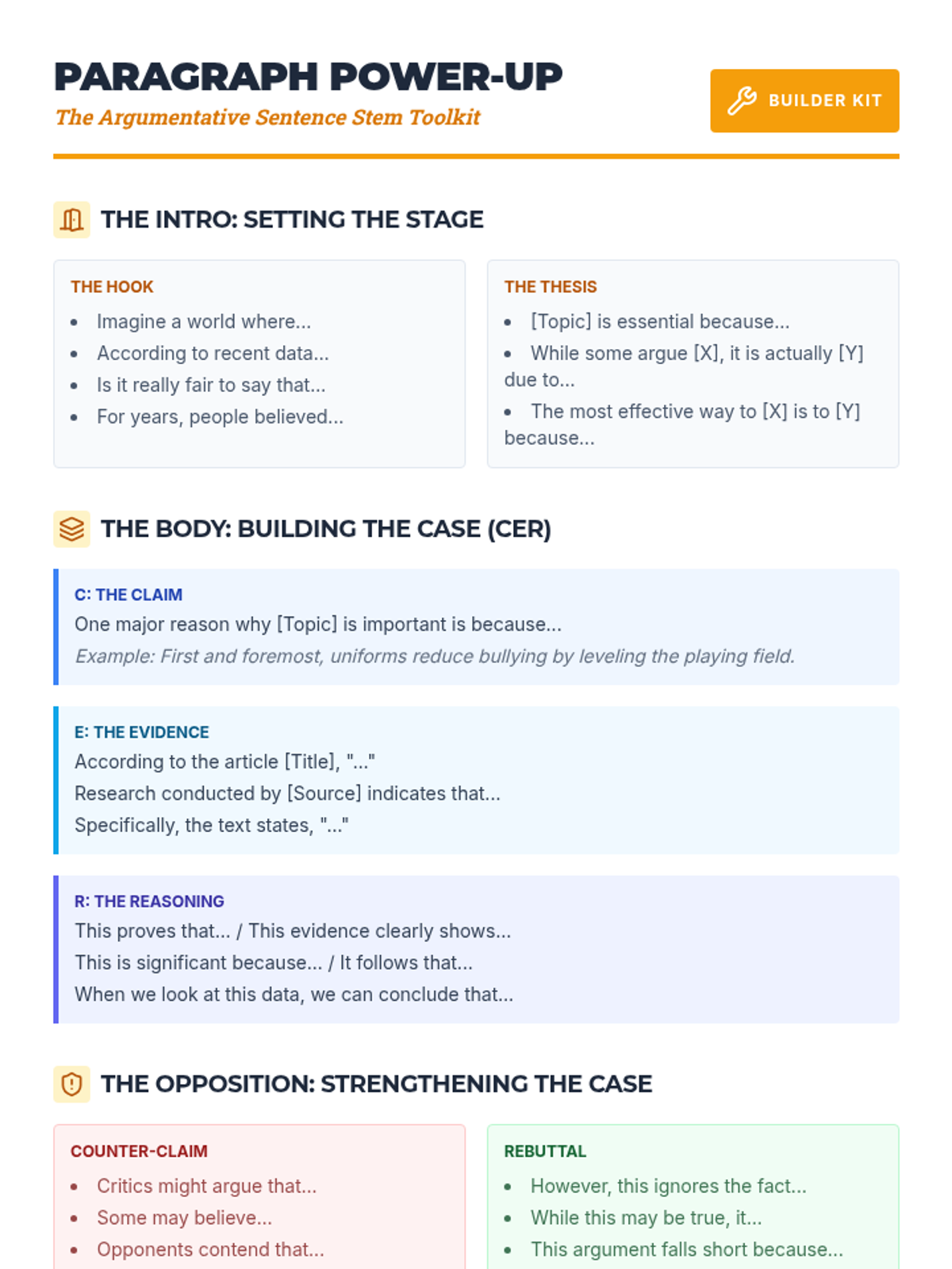A scaffolded reference sheet providing specific sentence stems and starters for every component of an argumentative essay, designed to support students in drafting clear claims, evidence, and reasoning.