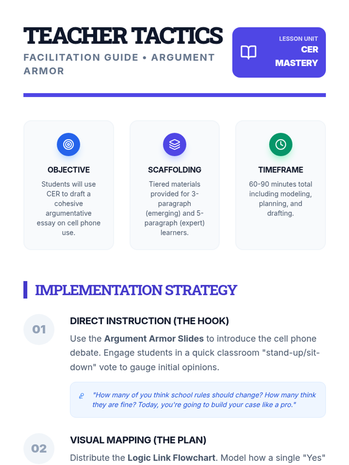 A teacher's guide for implementing scaffolded argumentative writing, featuring instructional strategies for using the CER framework and differentiated drafting tools.