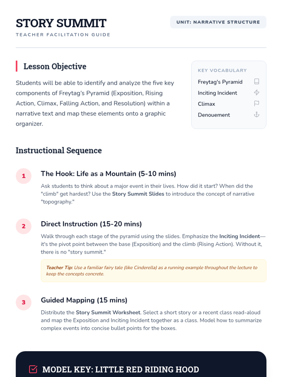 A comprehensive guide for teachers to facilitate the plot mapping lesson. Includes an instructional sequence, teacher tips, and a model answer key using a familiar fairy tale.