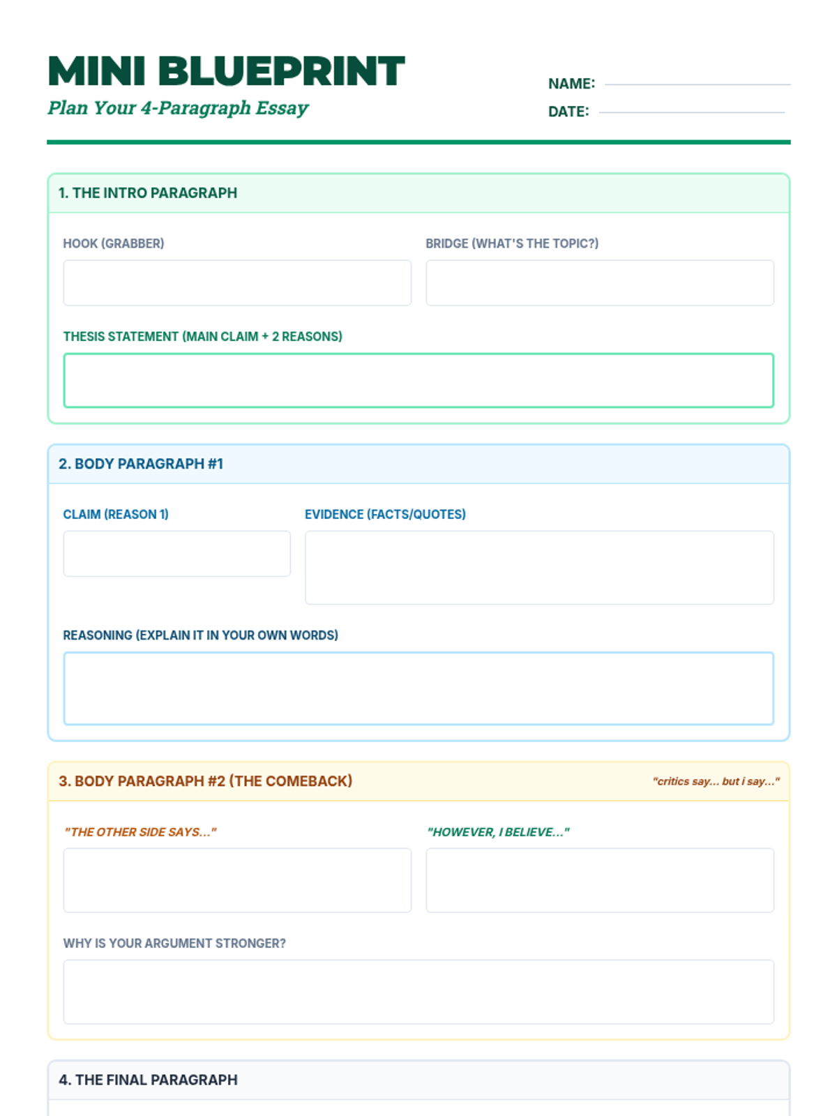 A simplified, single-page essay organizer for a 4-paragraph structure, including a word bank and clearer labels for beginners.