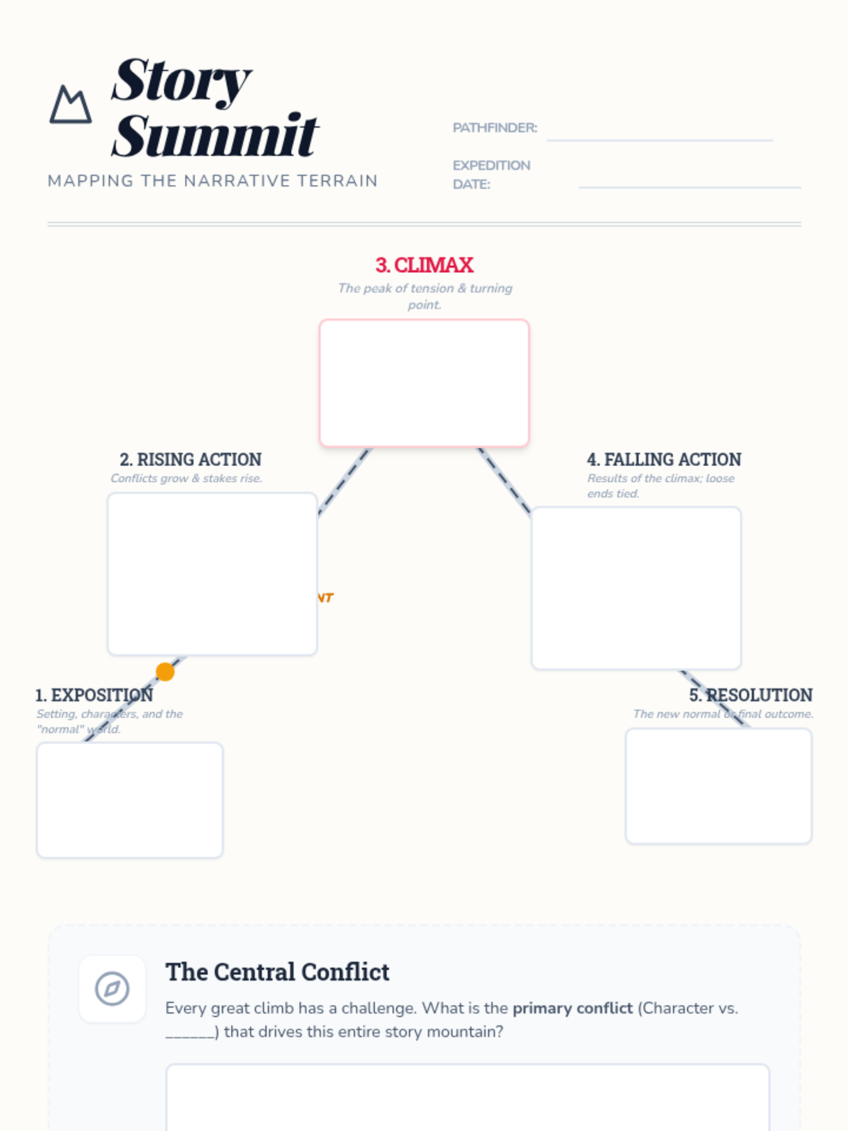A refined, adventure-themed plot diagram worksheet. Features a detailed "Story Summit" mountain with specialized areas for the inciting incident and a central conflict reflection box.