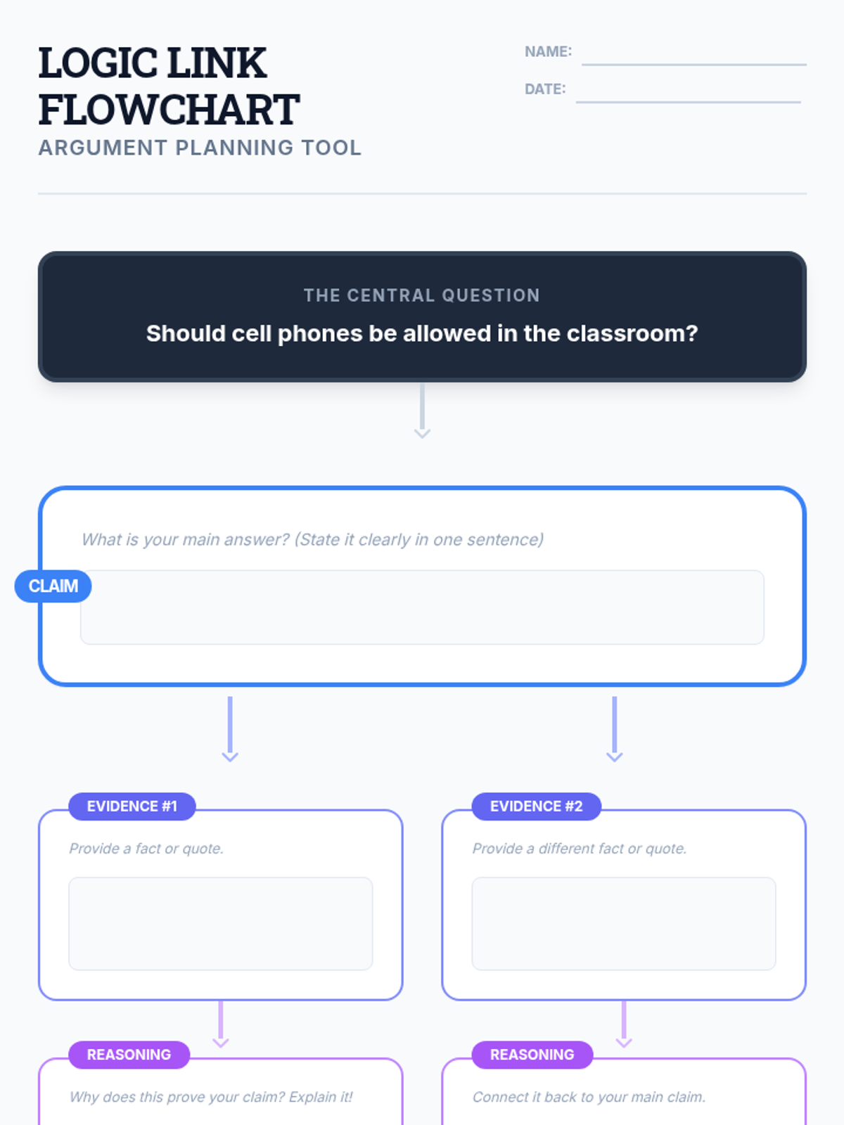 A visual flowchart for planning arguments, guiding students through the Claim, Evidence, and Reasoning (CER) process with structured work areas.