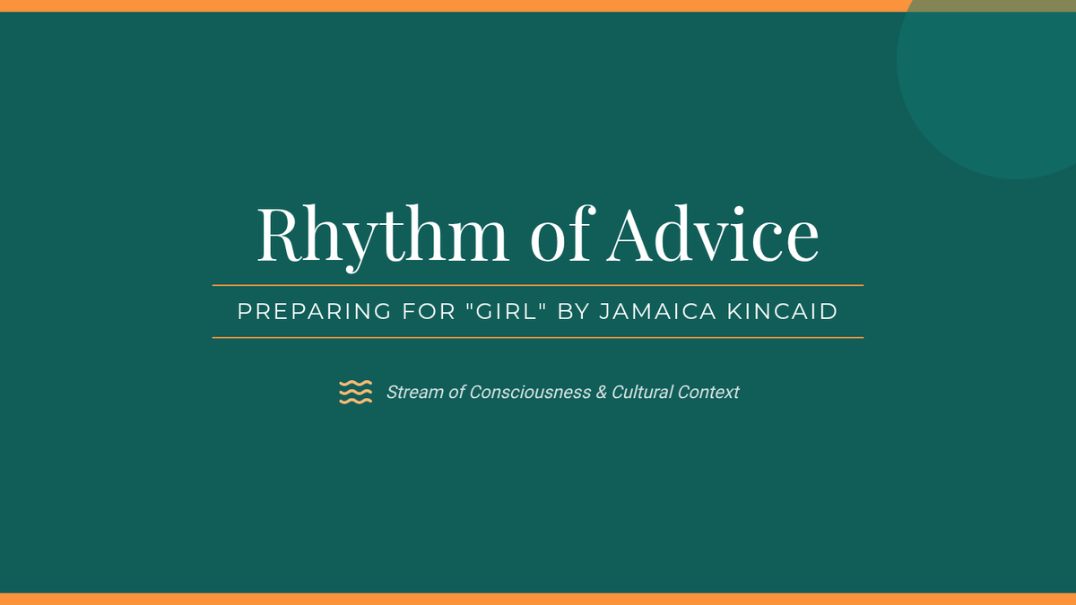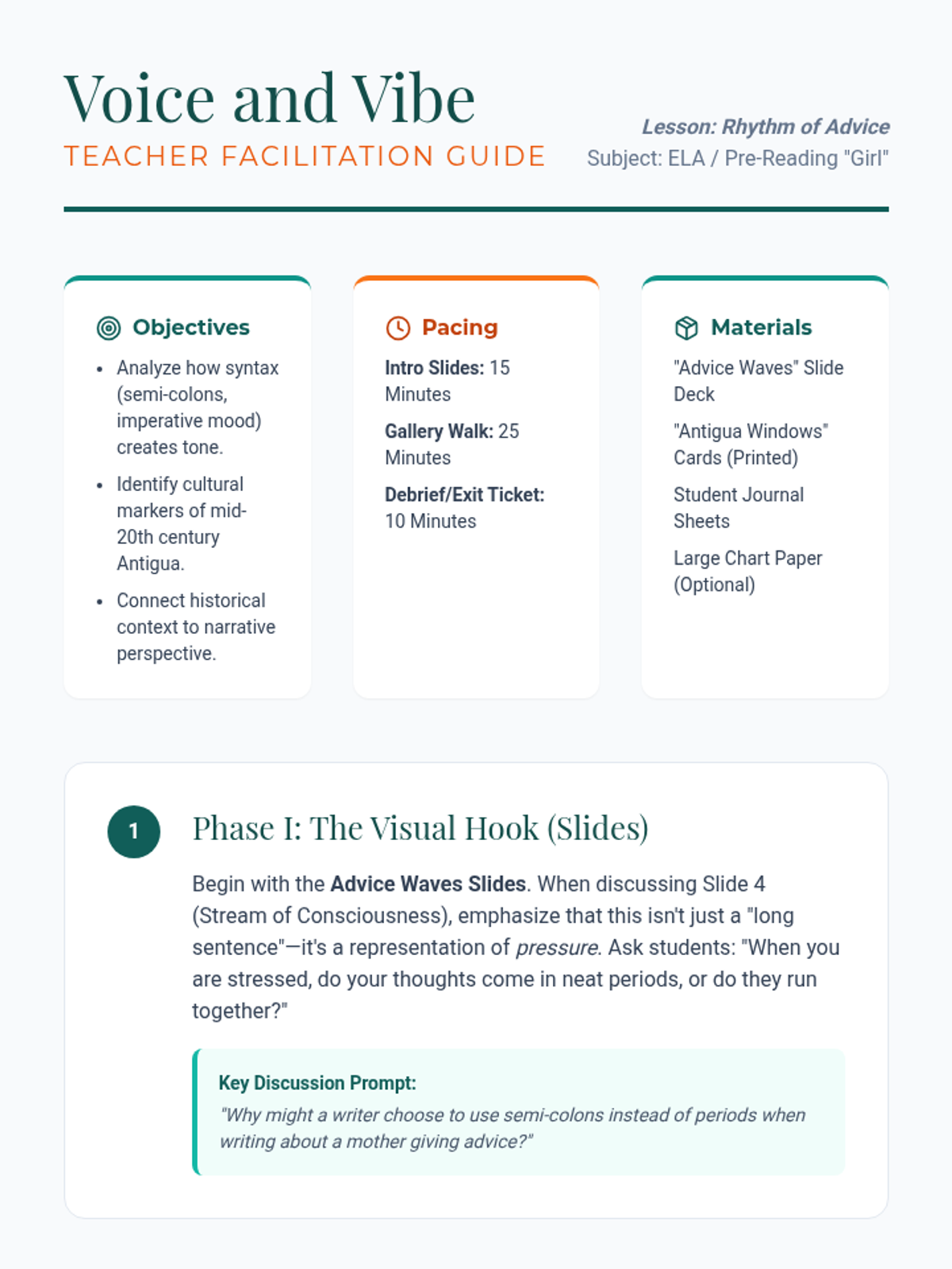 A comprehensive teacher guide for the 'Rhythm of Advice' lesson, providing pacing, instructional steps, discussion prompts, and background information on Antiguan culture and Jamaica Kincaid's literary style.