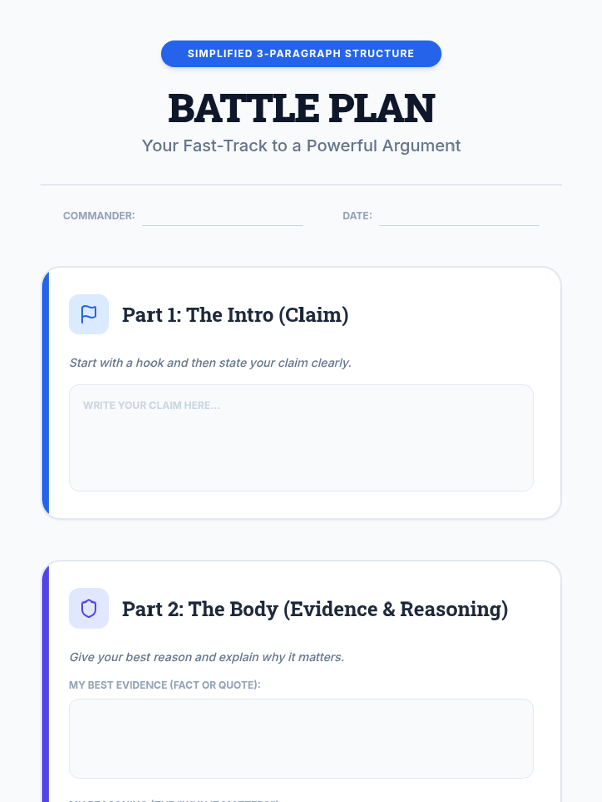 A simplified 3-paragraph drafting worksheet for argumentative writing, using the CER (Claim, Evidence, Reasoning) framework to scaffold the writing process.