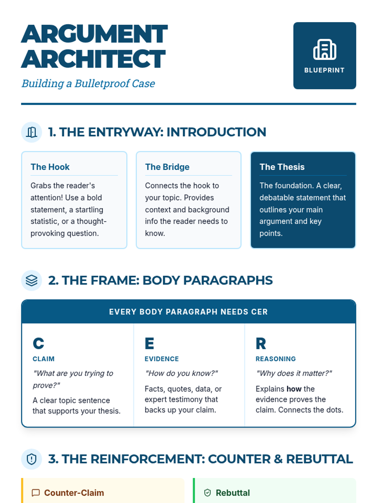 A simplified visual anchor chart using "Argument Blocks" to explain essay structure with less text and more visual metaphors, focusing on "The Comeback" and "CER" in an accessible way.