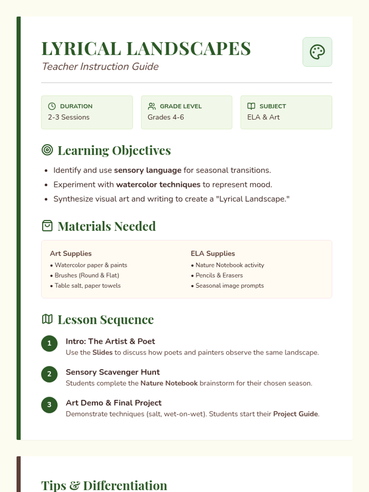 A comprehensive teacher guide for the Lyrical Landscapes lesson, including learning objectives, material lists, instructional sequences, and differentiation strategies for blending poetry with watercolor art.