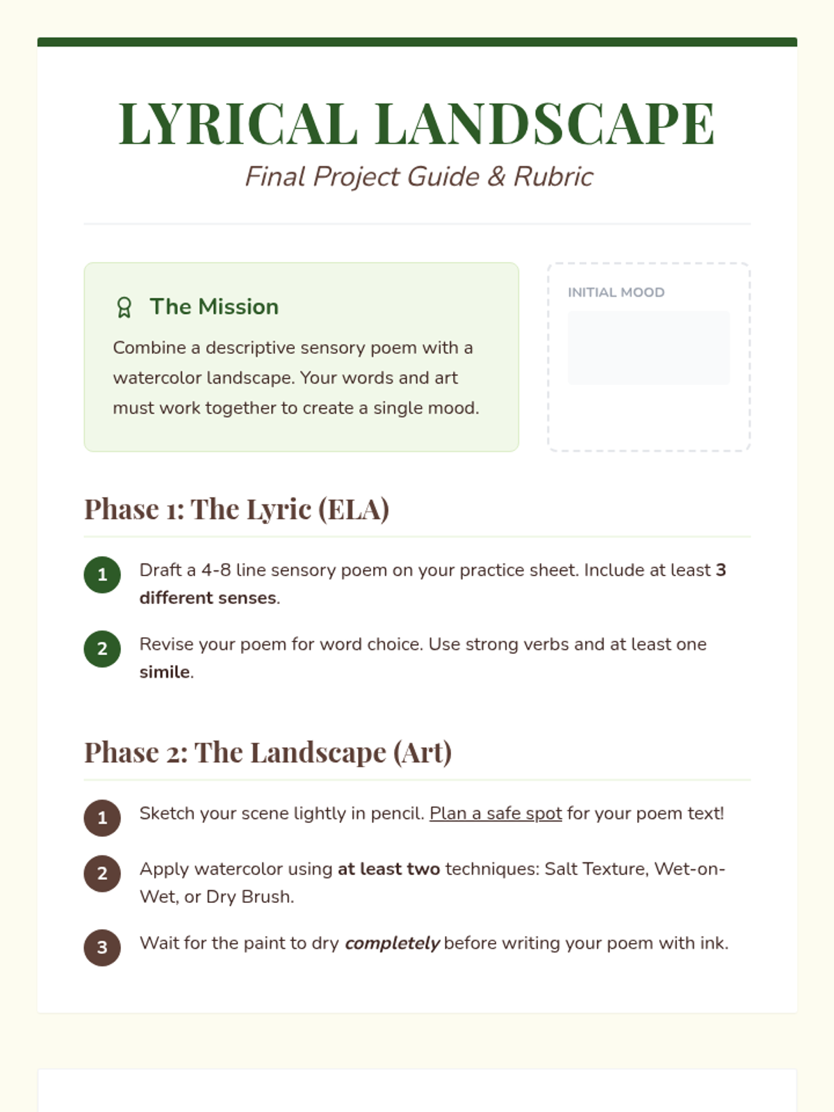 A final project guide for the Lyrical Landscapes lesson. It includes a two-phase mission (Poetry and Art), step-by-step instructions for synthesis, and a detailed rubric for assessment.