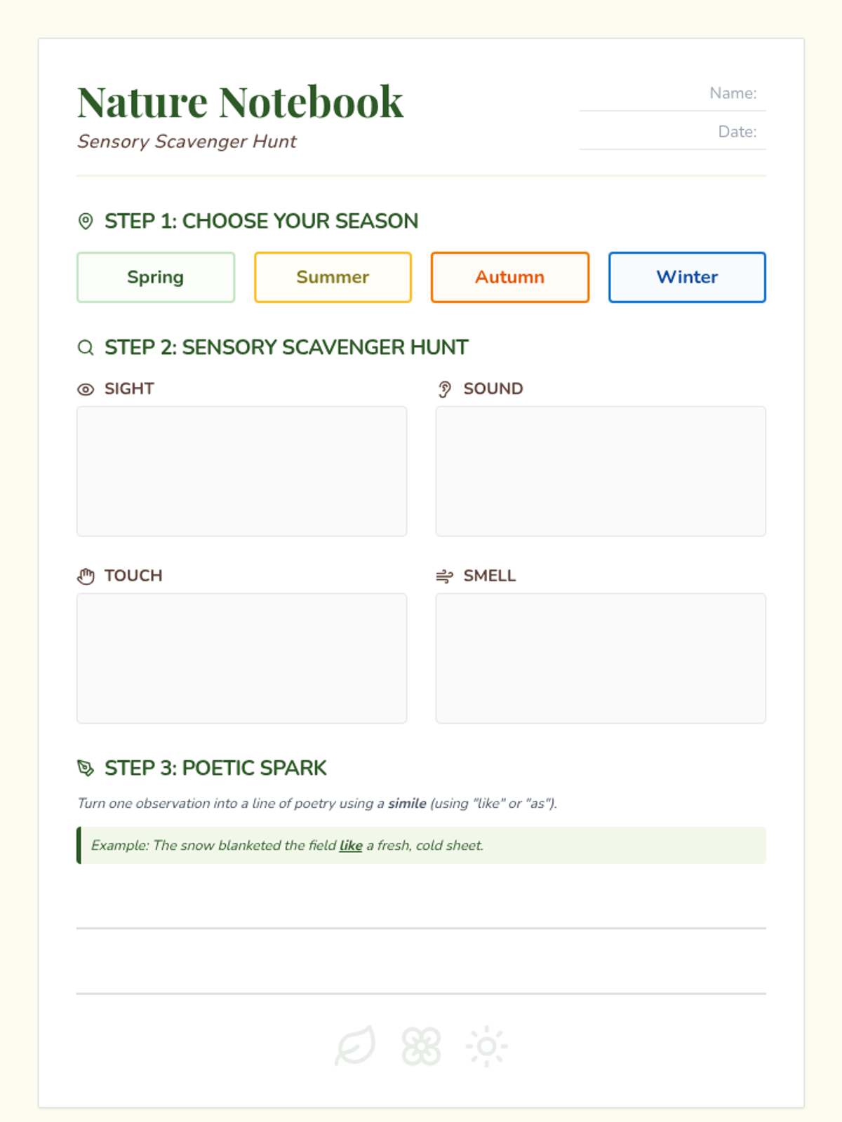 A student worksheet for brainstorming sensory details about New England seasons. Includes sections for sight, sound, touch, and smell observations, and a prompt for drafting poetic similes.