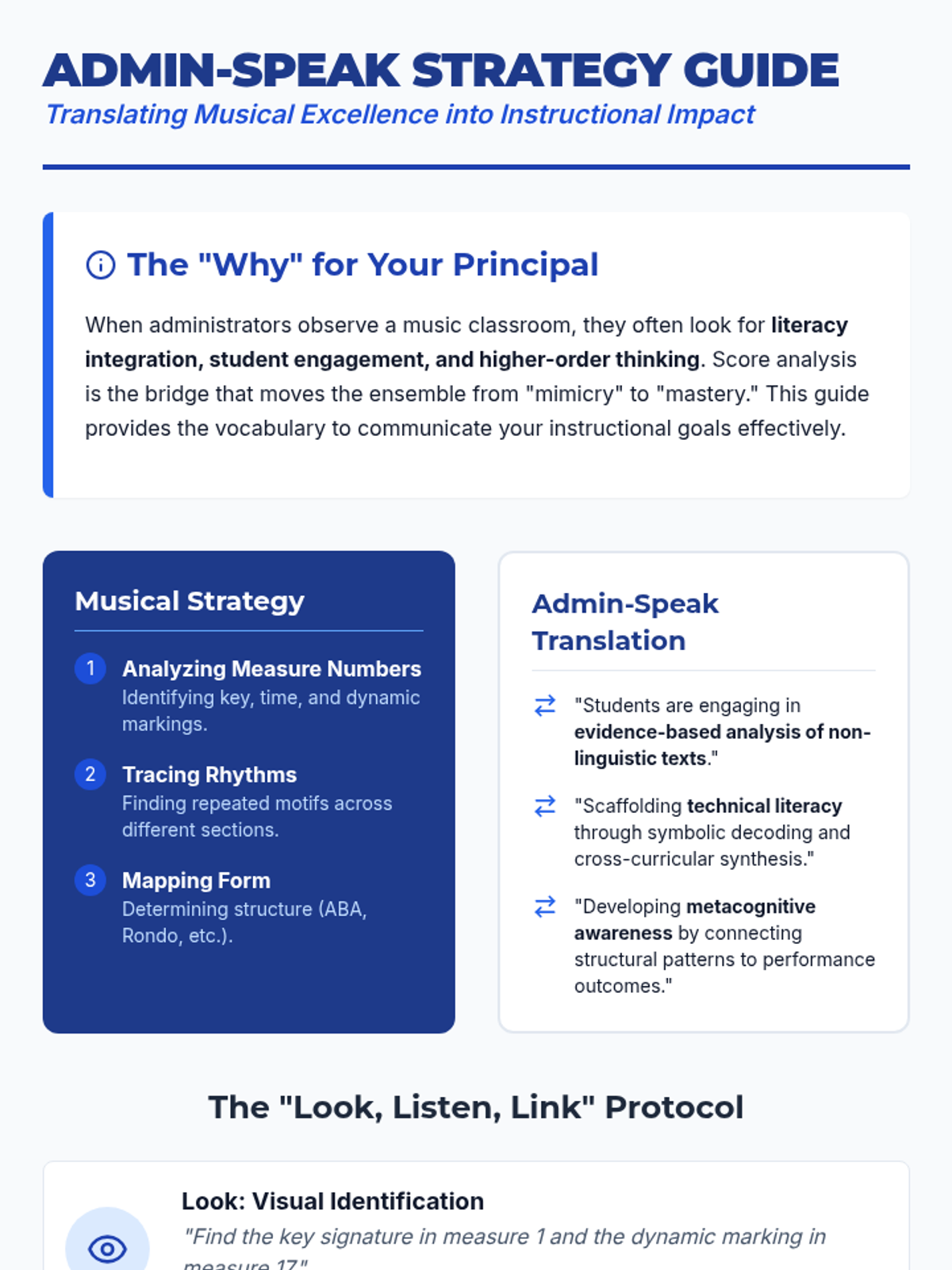 A professional development guide for music teachers that provides pedagogical strategies for score analysis and 'admin-speak' terminology to communicate instructional value to principals and evaluators.