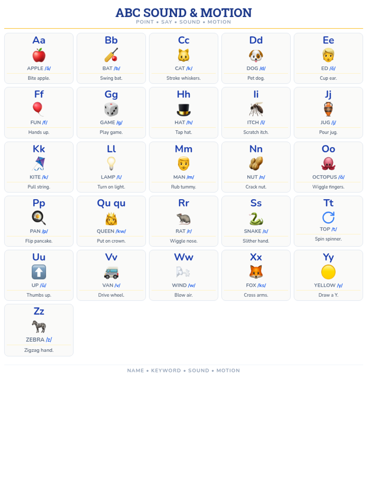 A comprehensive A-Z reference chart featuring Fundations-style keywords, letter forms, and descriptive hand motions for kinesthetic learning. This printable guide helps students master letter-sound correspondence through multiple modalities.