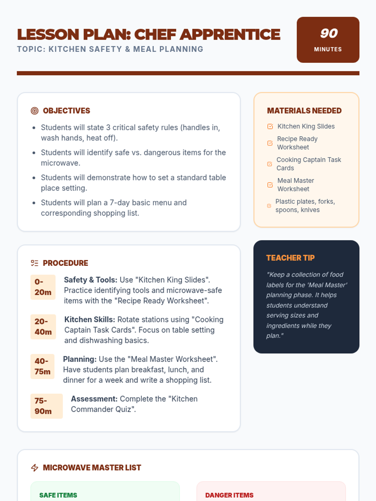 A printable teacher's lesson plan for Chef Apprentice, covering kitchen safety, tool identification, table setting, and a 90-minute procedure for meal planning.