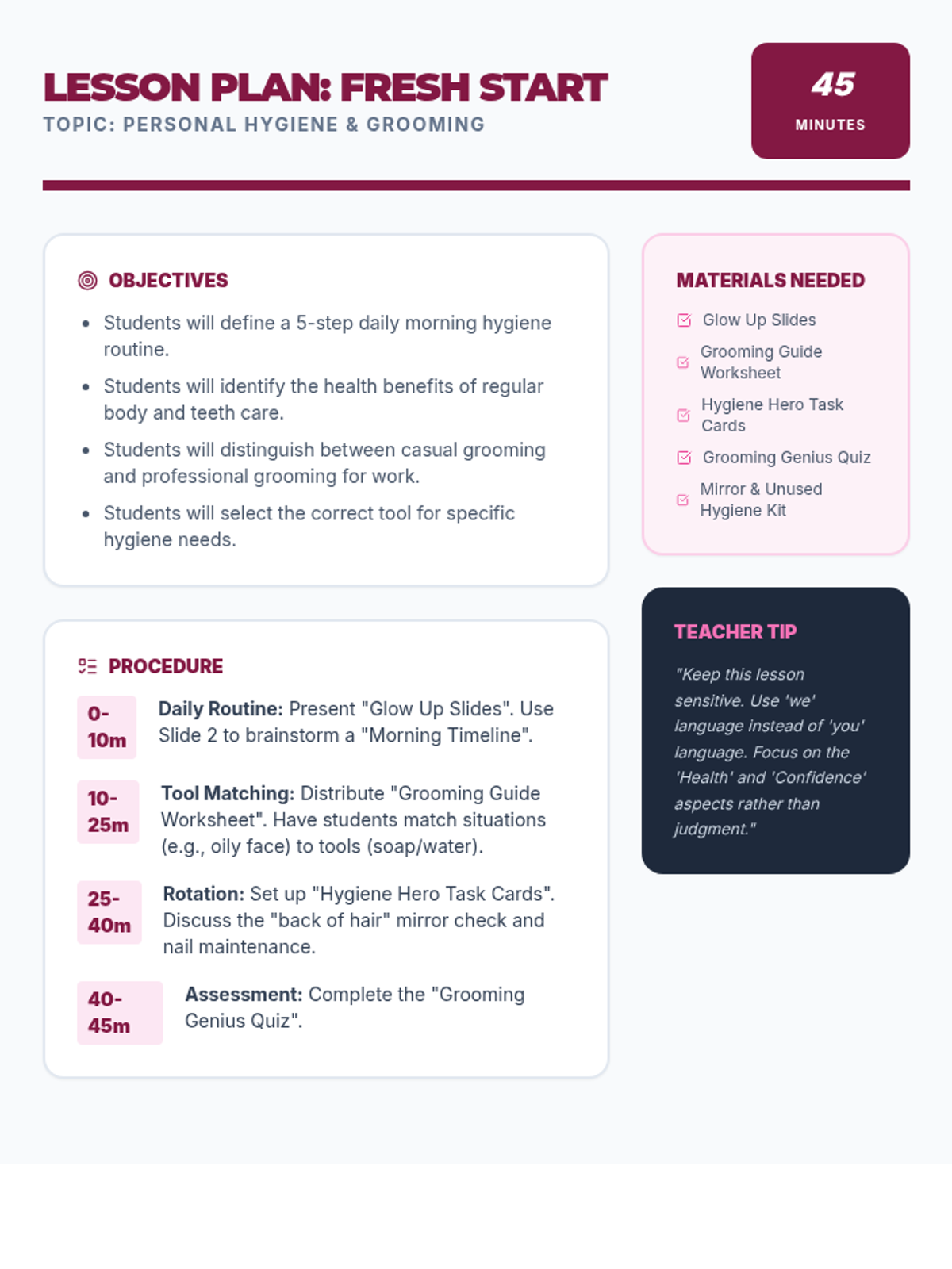 A printable teacher's lesson plan for Fresh Start, covering daily hygiene routines, tool selection, and professional grooming standards.